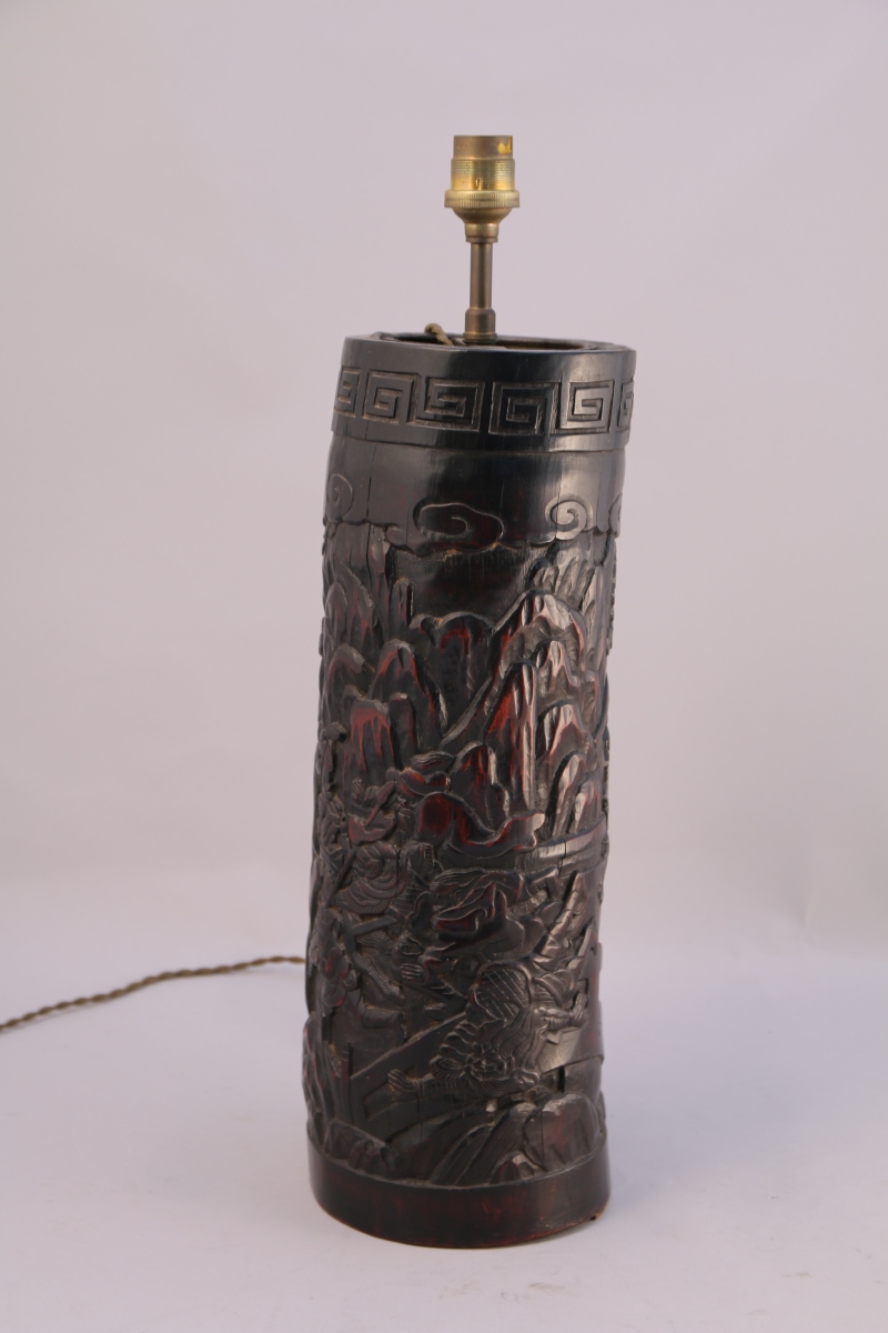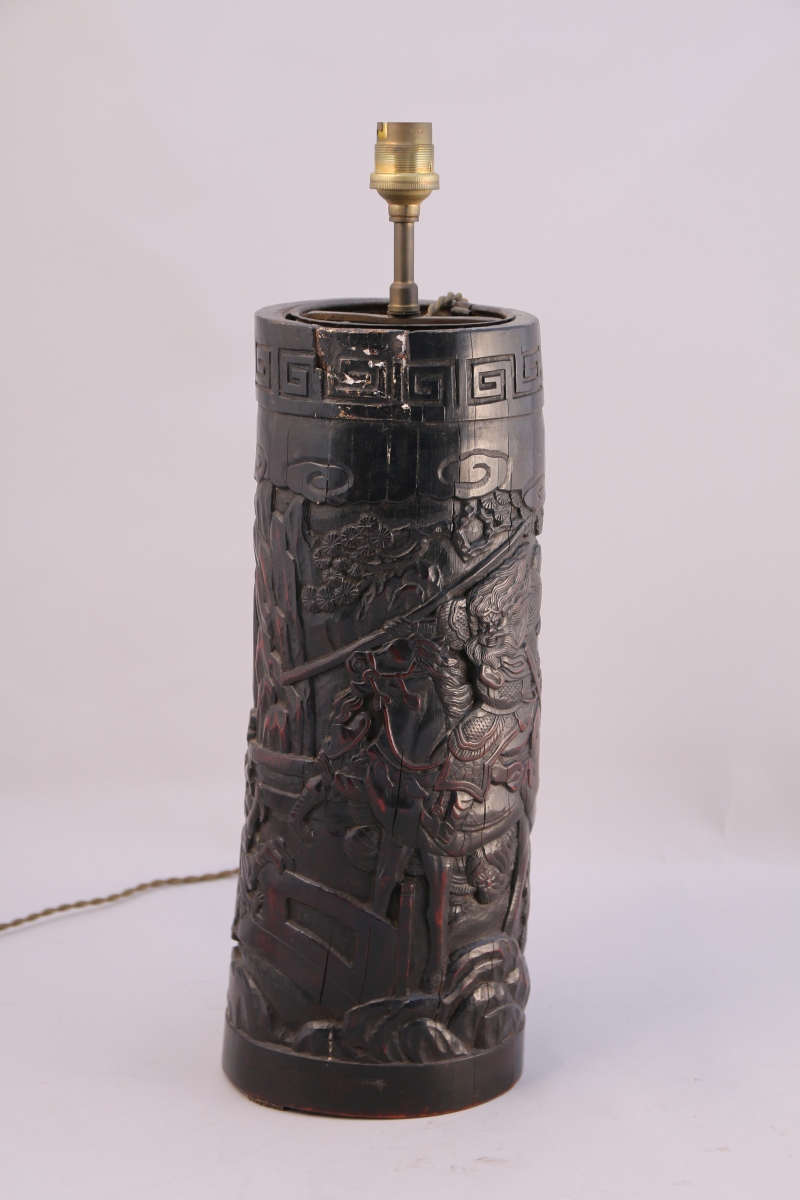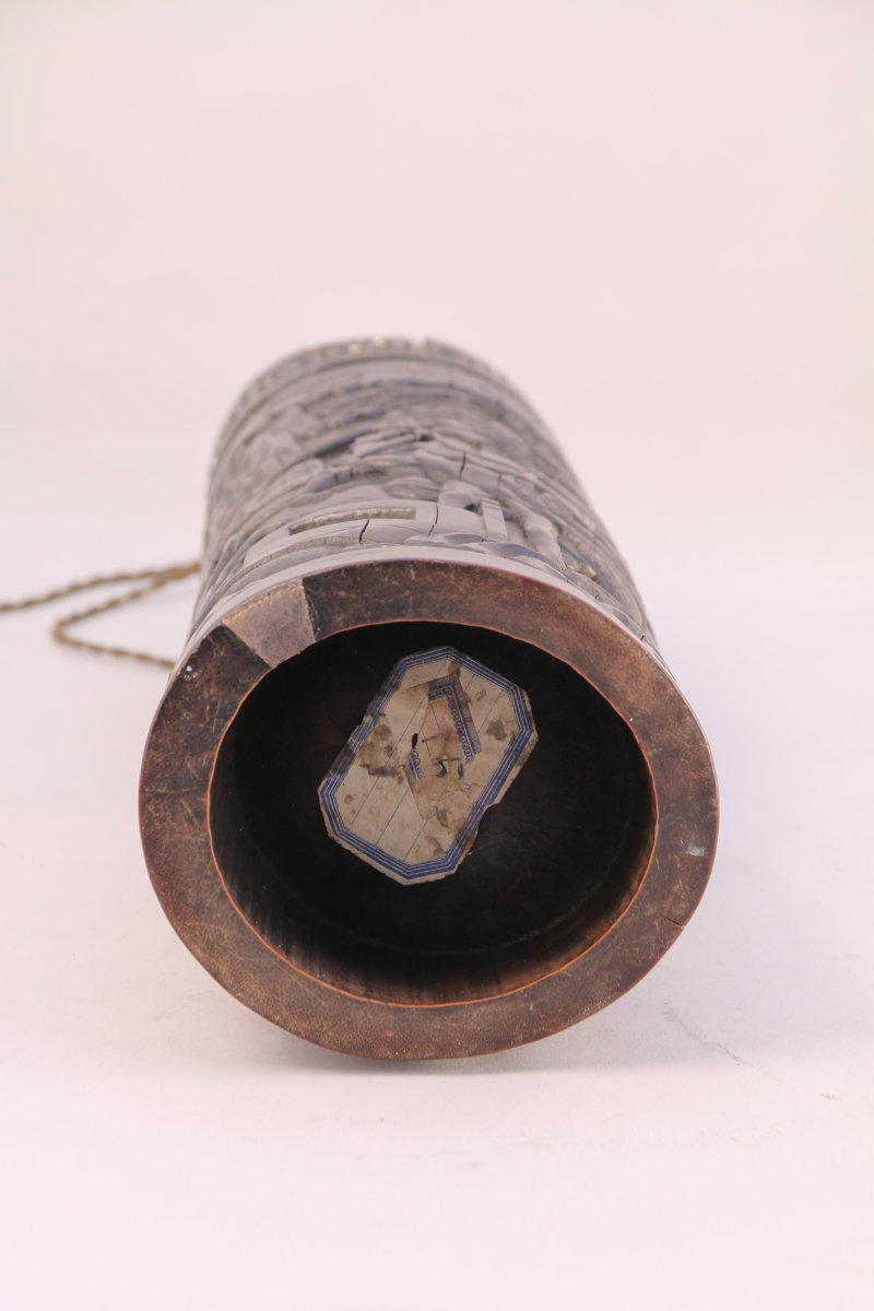 CHINE - Début XXe. PORTE-PINCEAUX en bambou sculpté d'une scène représentant Zhong Kui chassant des démons. (Electrifié). Haut. 36 cm.