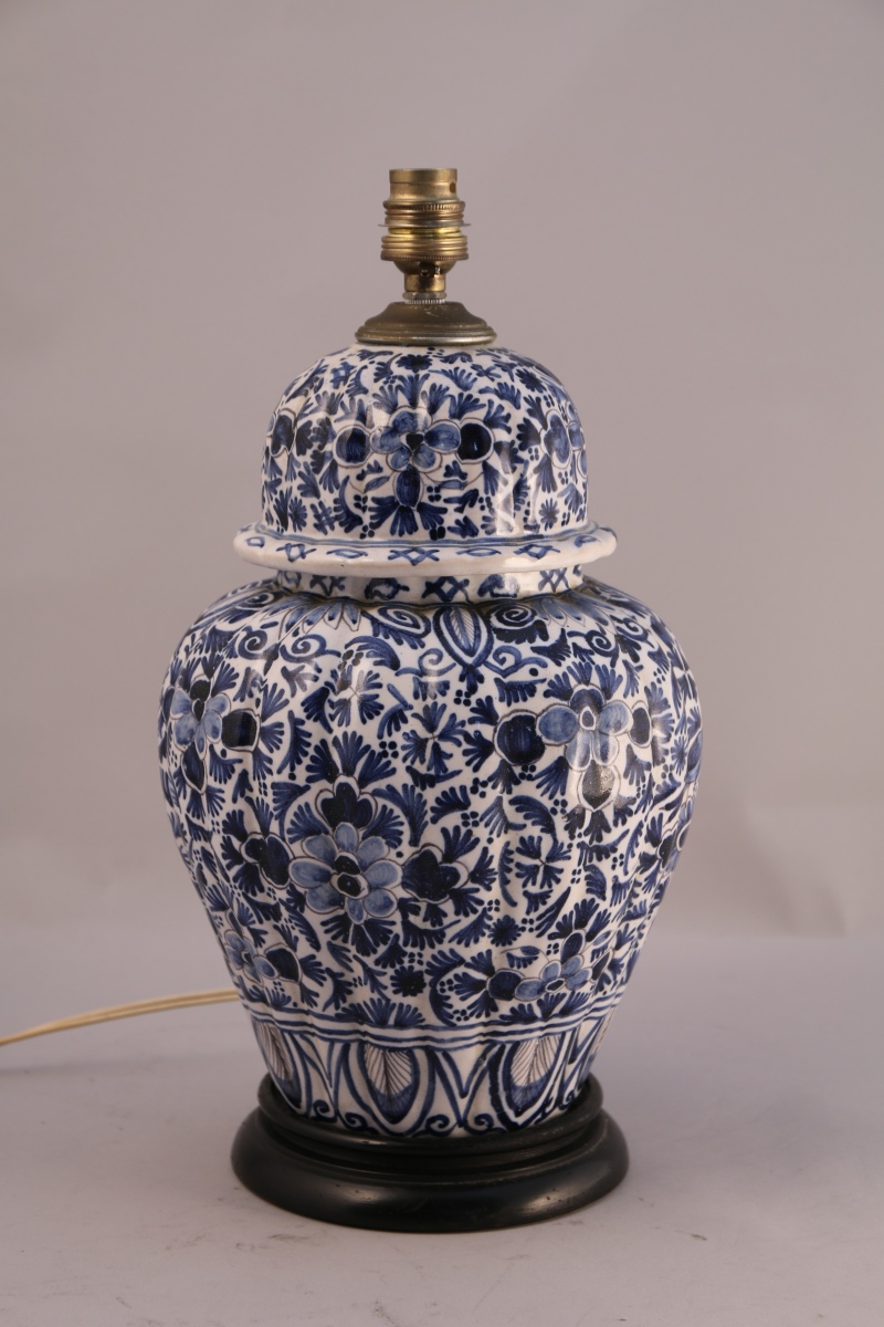 JOINT: POTICHE couverte en céramique dans le goût de Delft, socle bois noirci (électrifiée). Haut. 32 cm.