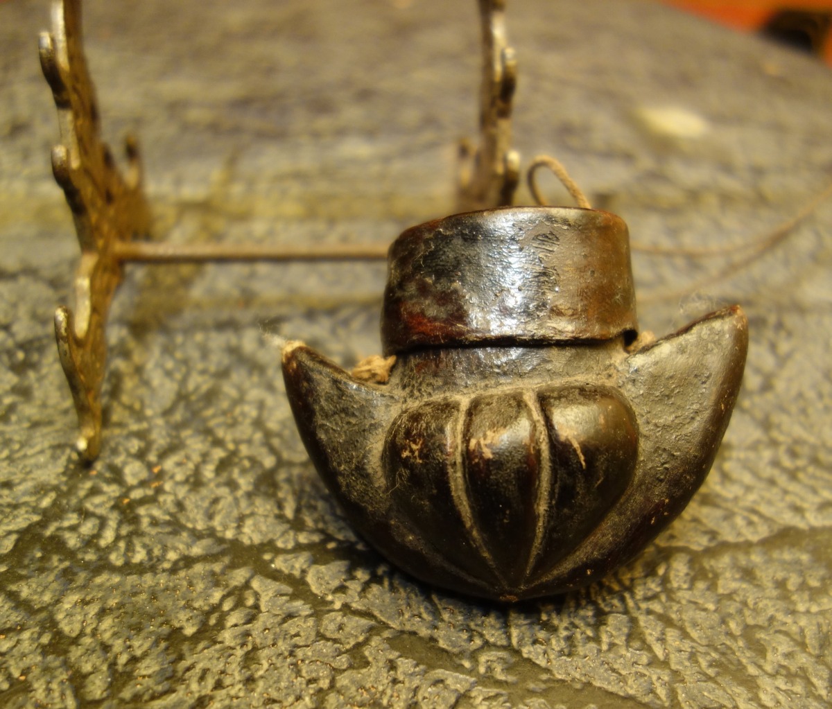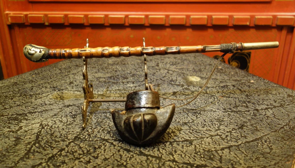 CHINE. PIPE à OPIUM en bambou noueux et métal à la façon d'un corps de serpent, avec un étui à opium en cuir en forme de fleurs de pavot.