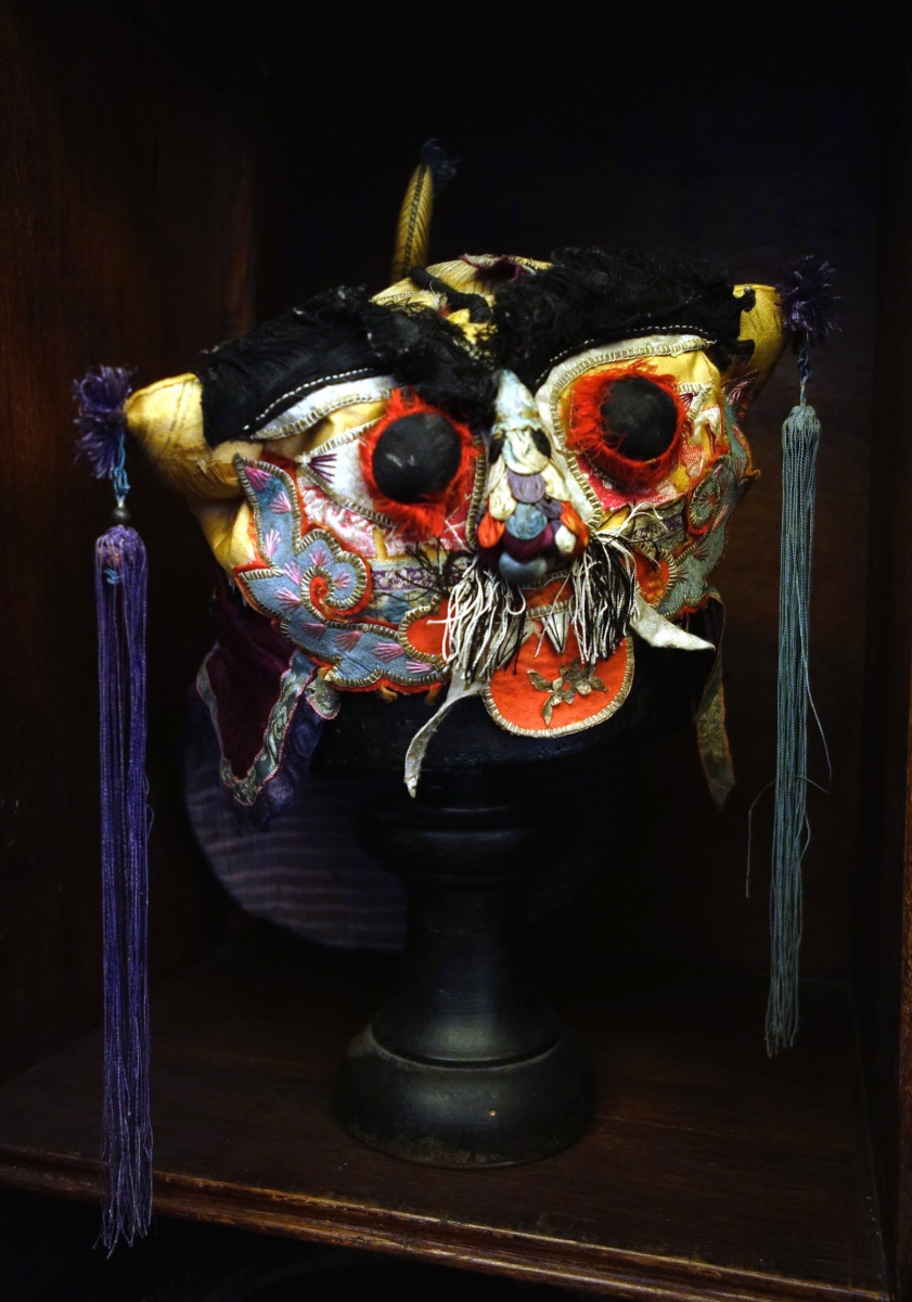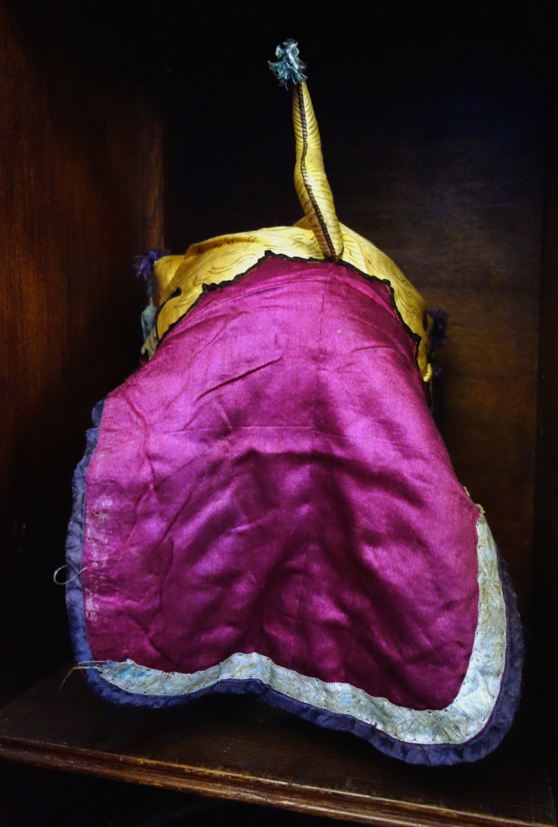 CHINE. MASQUE/BONNET de théâtre chinois en soie brodée.