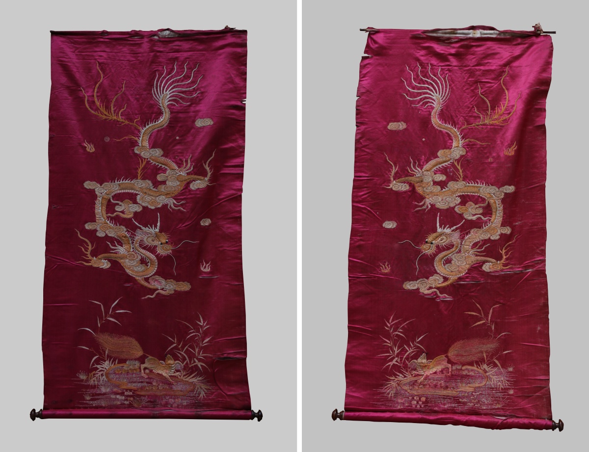 INDOCHINE - DEUX PAIRES de BANNIÈRES en soie. L'une à fond jaune, l'autre à fond rouge, à décor du dragon impérial. Origine Viet-Nam.