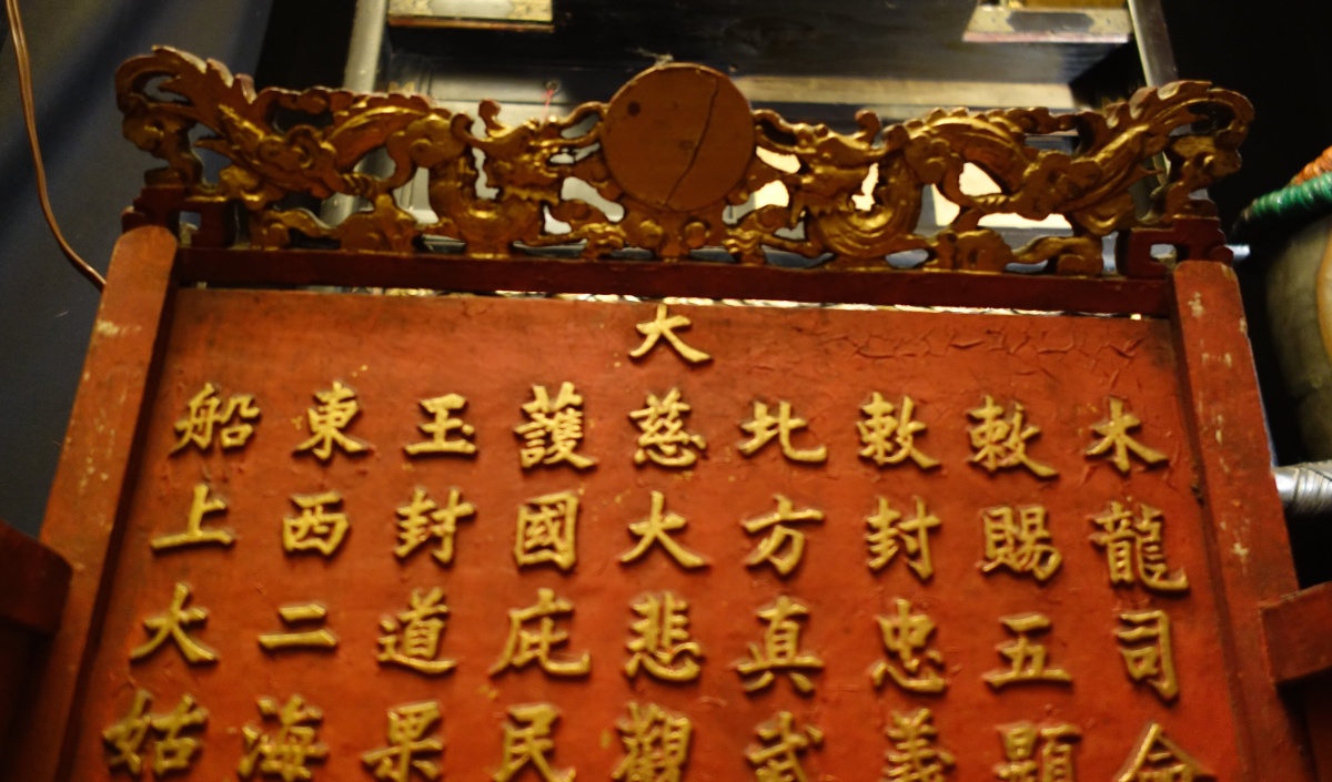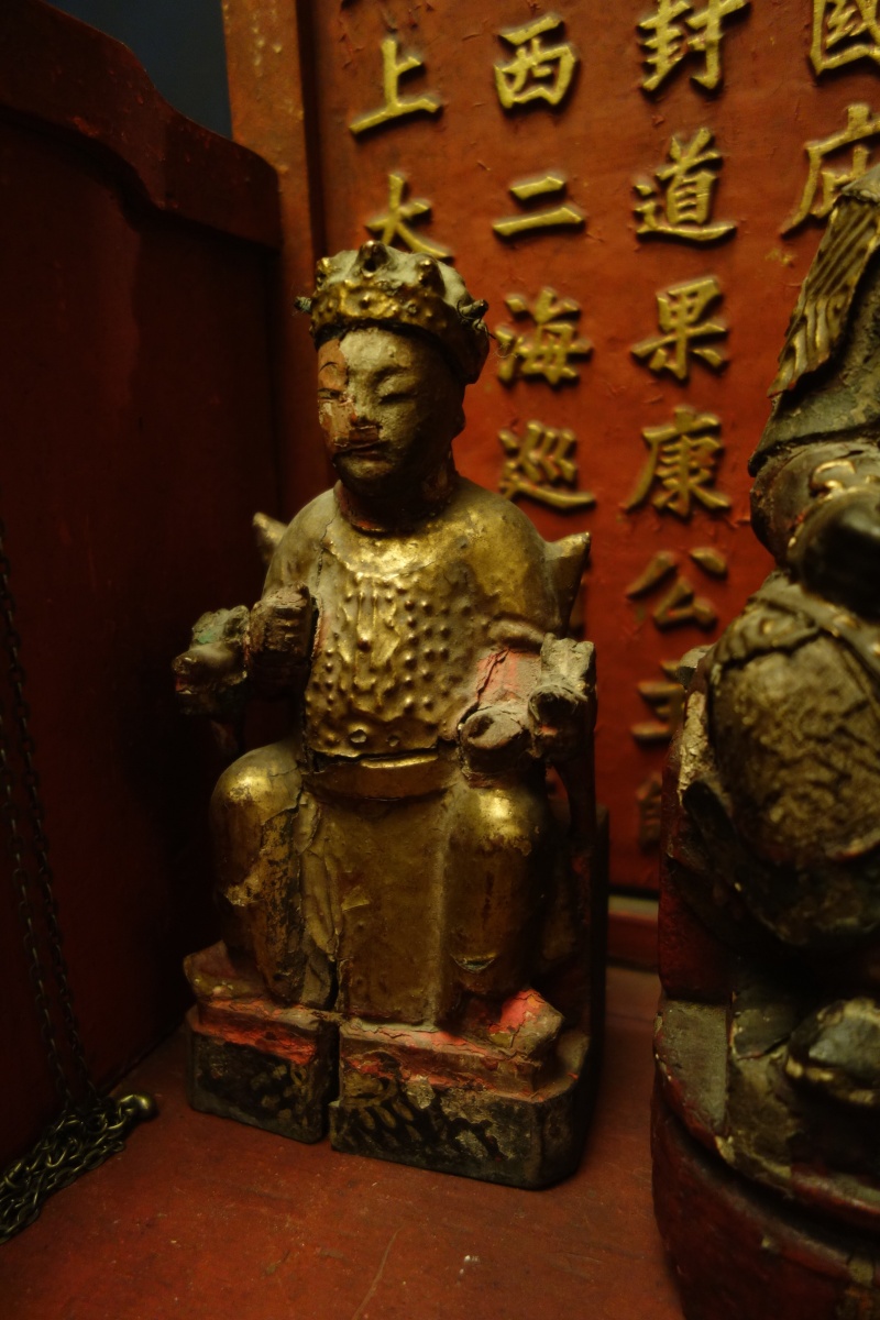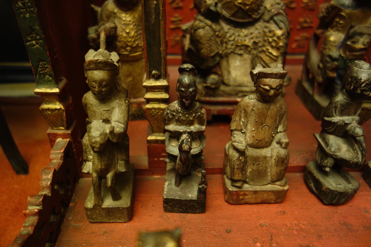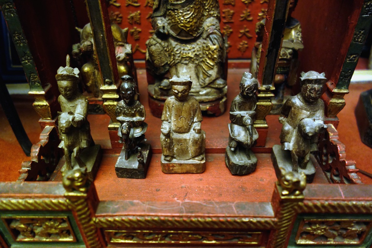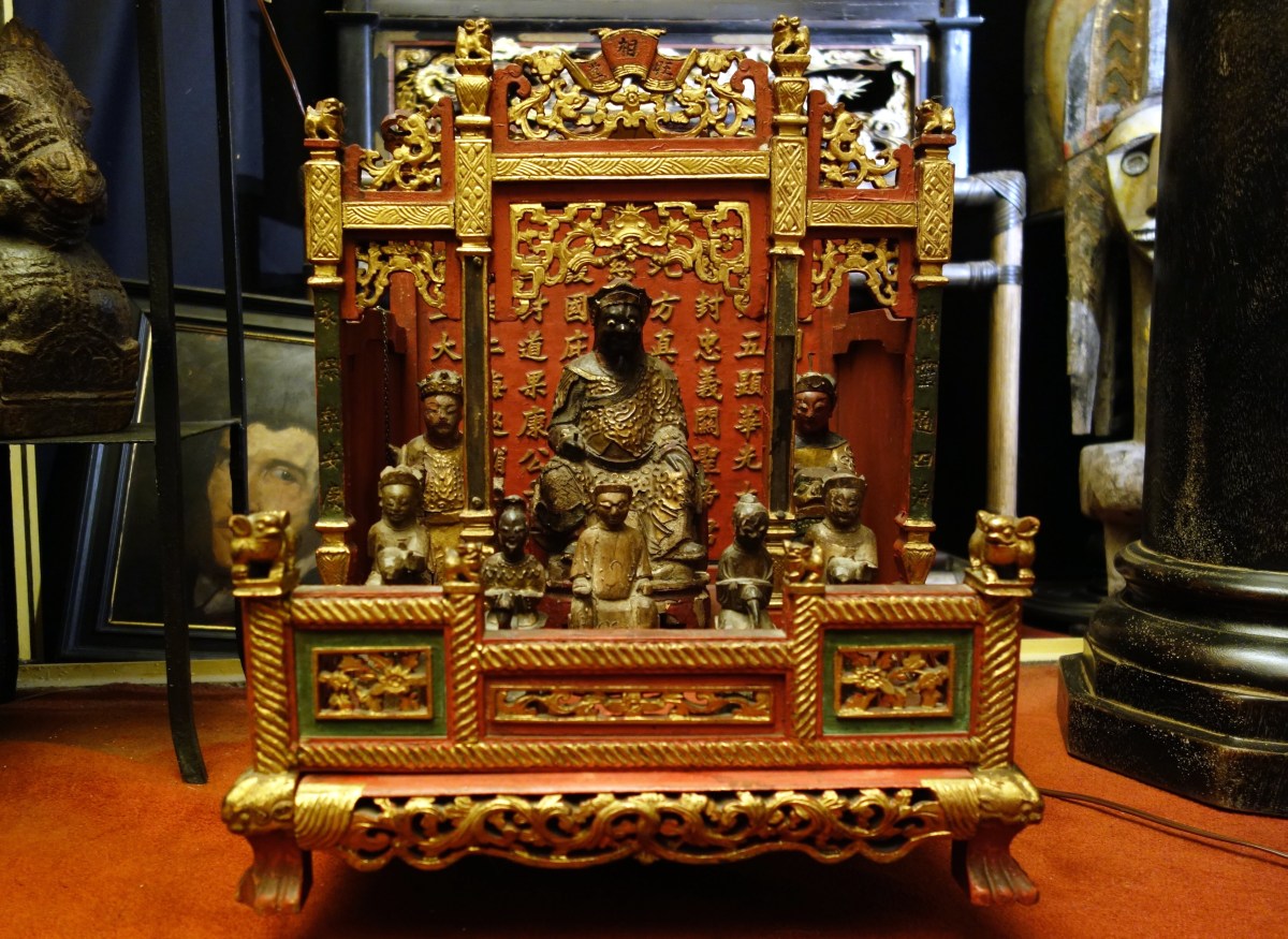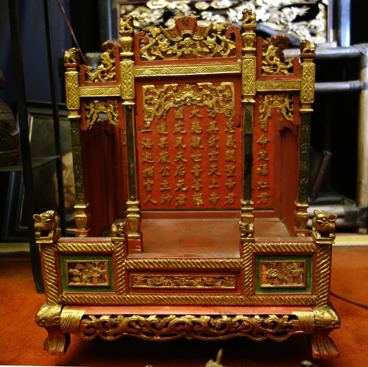 CHINE - XVIIIe? AUTEL de VOYAGE TAOÏSTE en bois sculpté et laqué rouge et or, orné de huit divinités. Idéogrammes en ancien chinois.