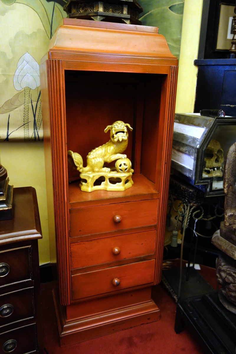 CHINE - Dans le goût de. ÉTAGÈRE en forme de pagode en bois laqué rouge avec un caisson central et trois tiroirs.