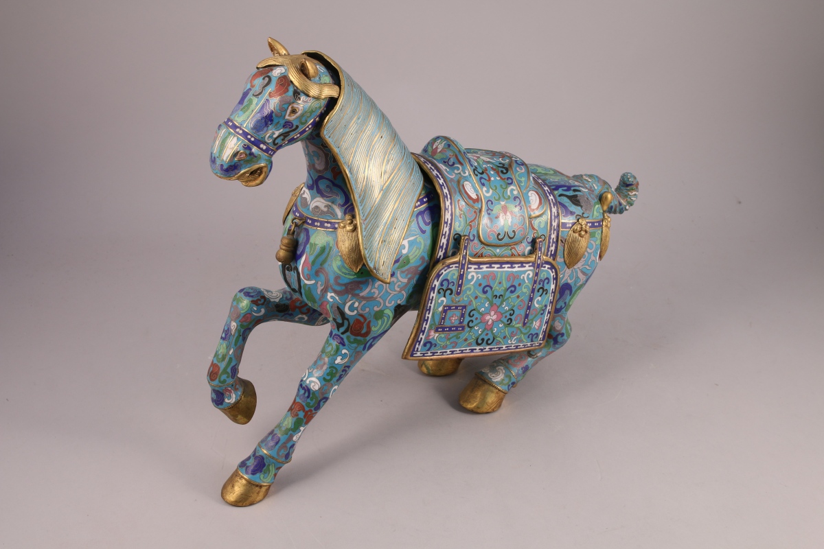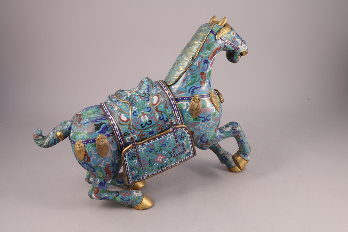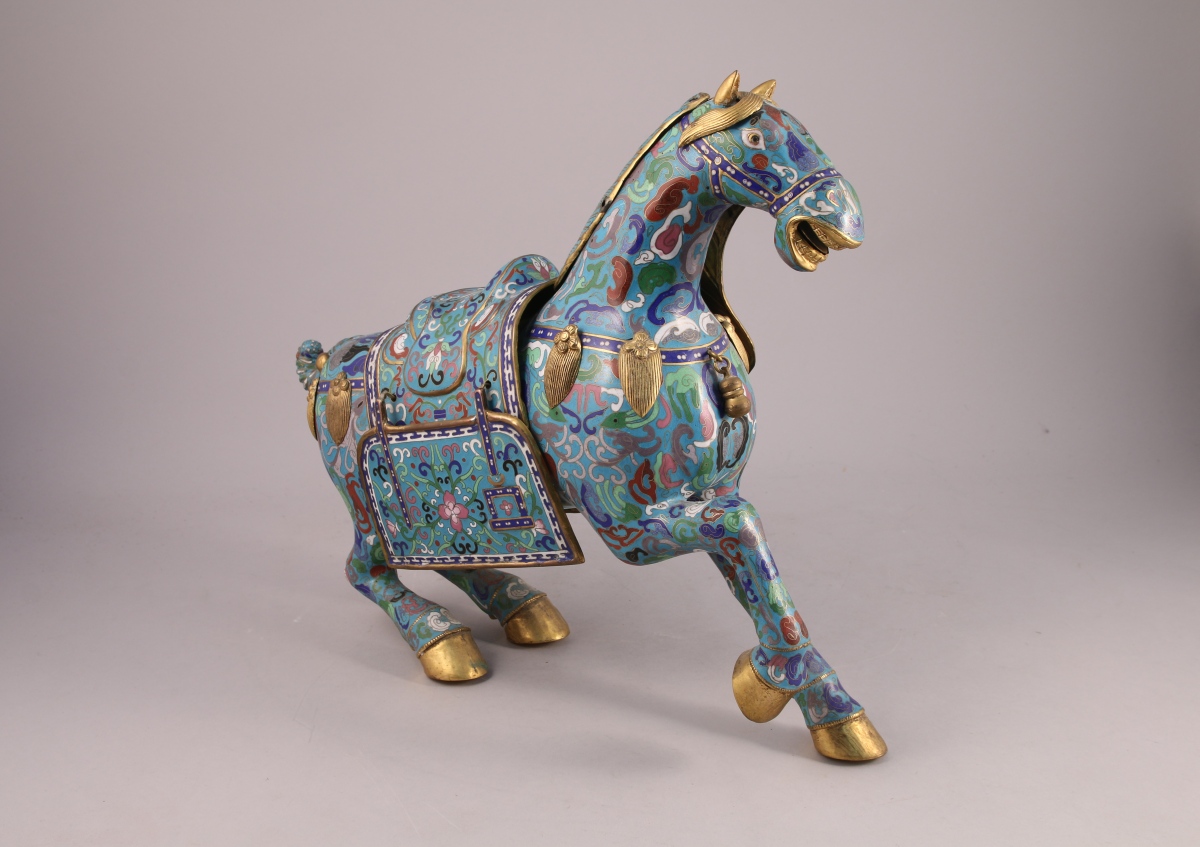 CHINE - XXe. BRÛLE-PARFUM adoptant la forme d'un CHEVAL en bronze à décor d'émaux cloisonnés.