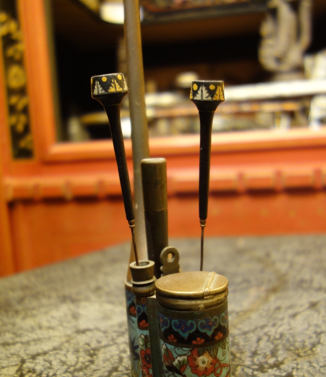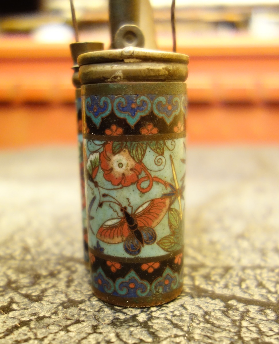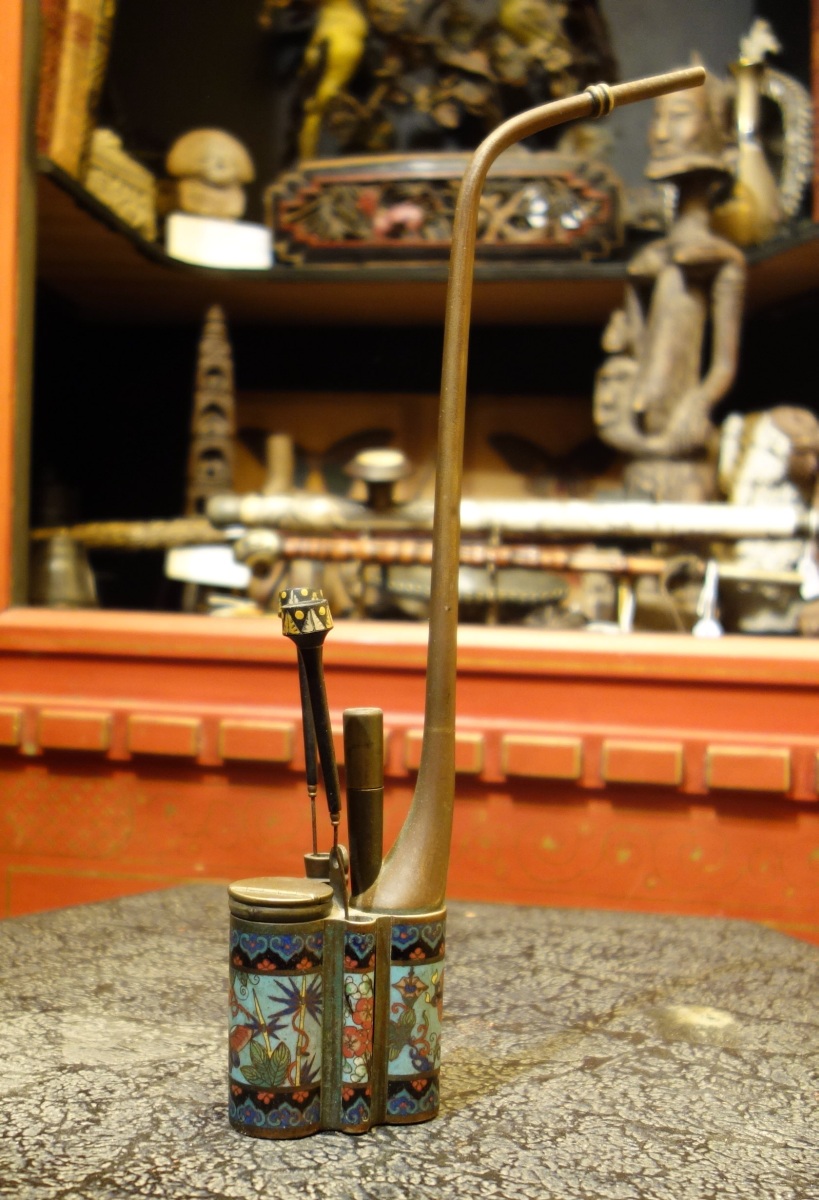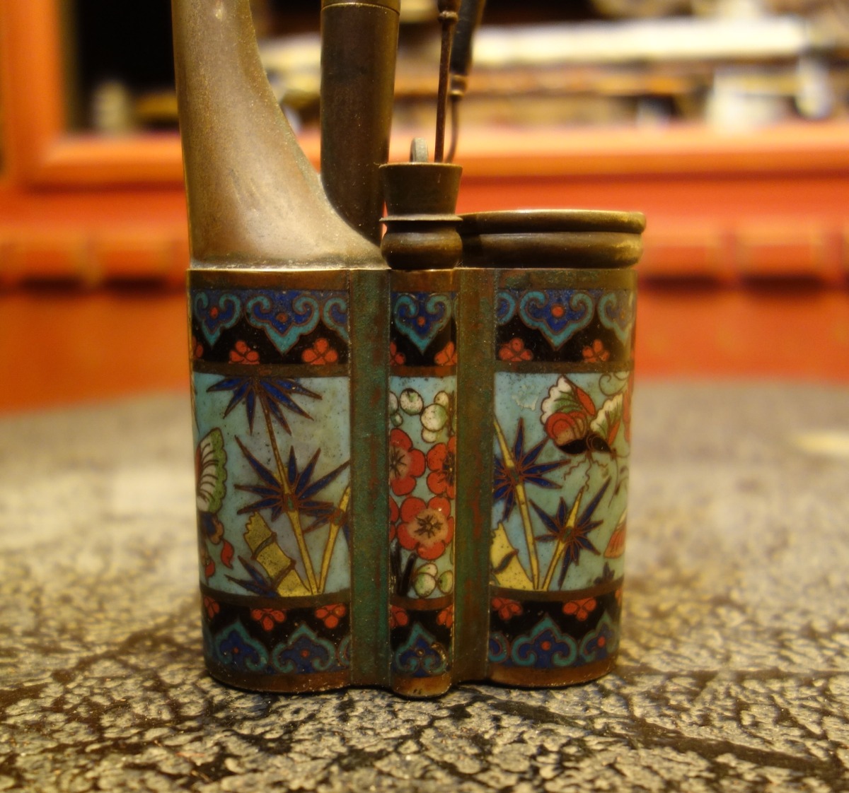 CHINE - XIXe. PIPE en bronze et laiton à décor d'émaux cloisonnés figurant des papillons et de fleurs sur un fond turquoise.
