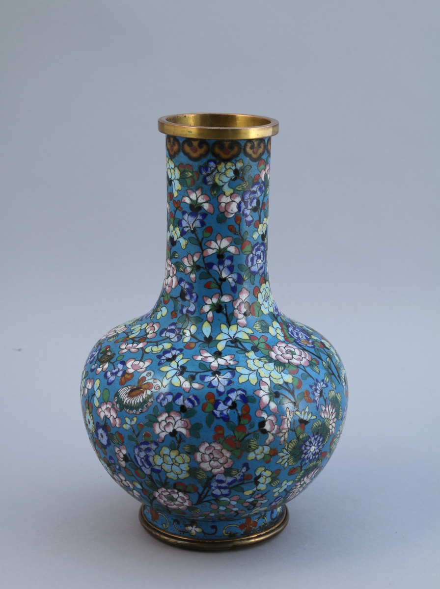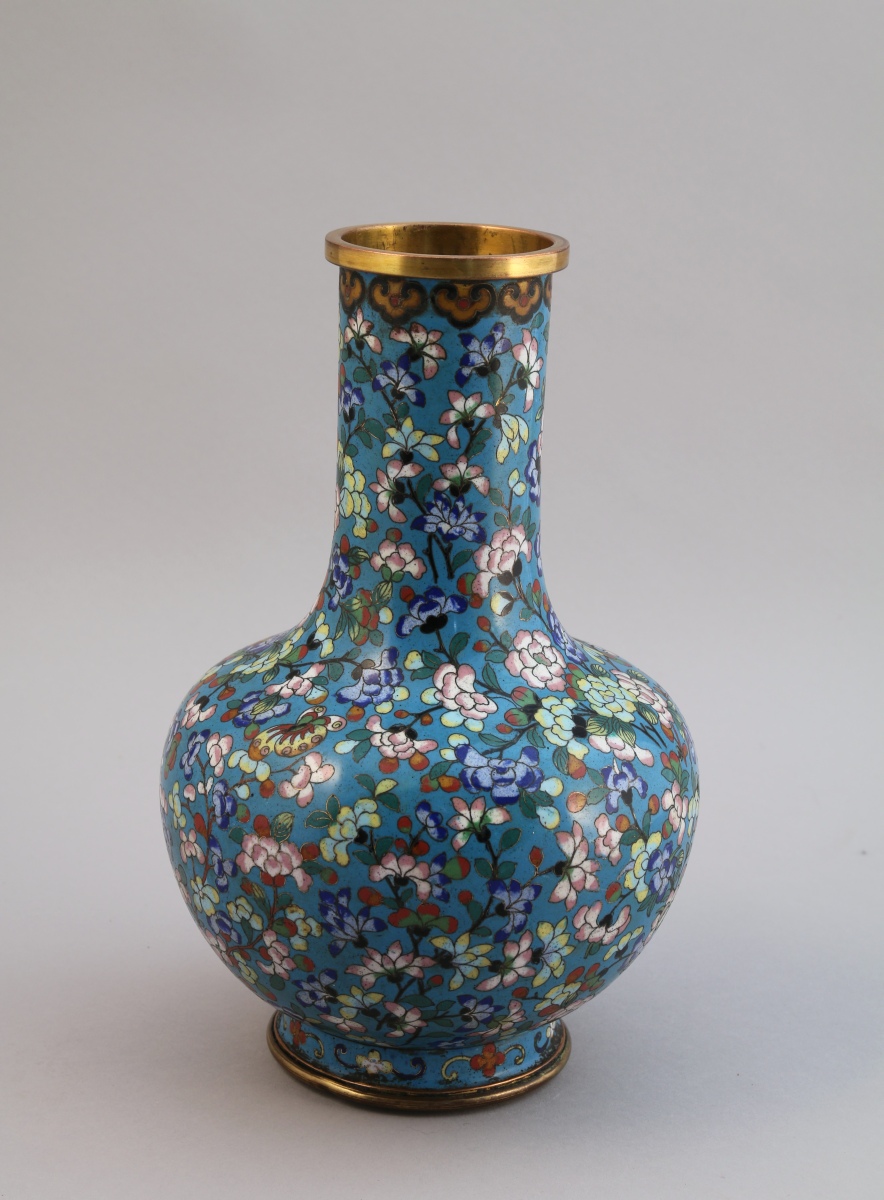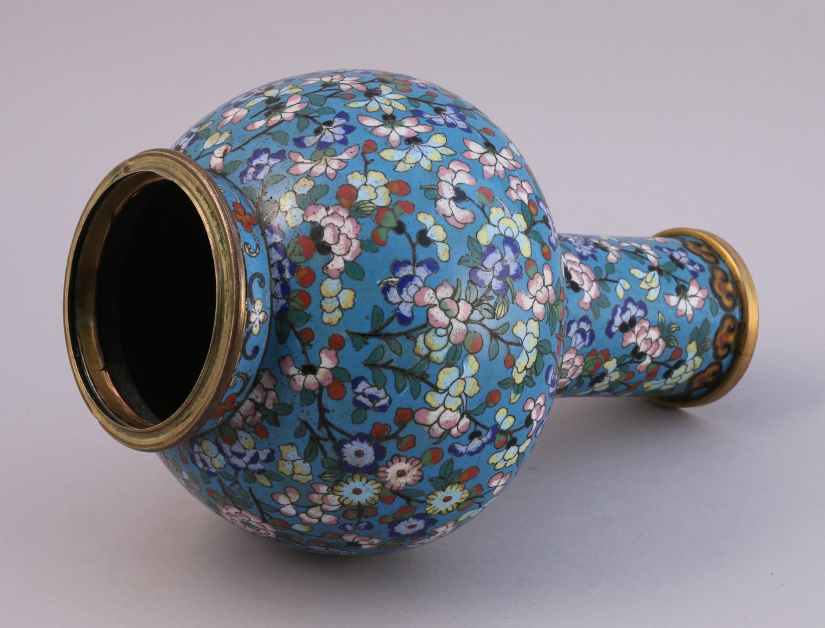 CHINE. VASE BALLUSTRE en émail cloisonné. Le fond percé.