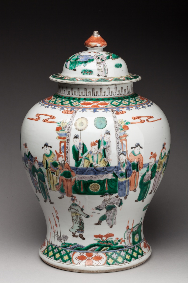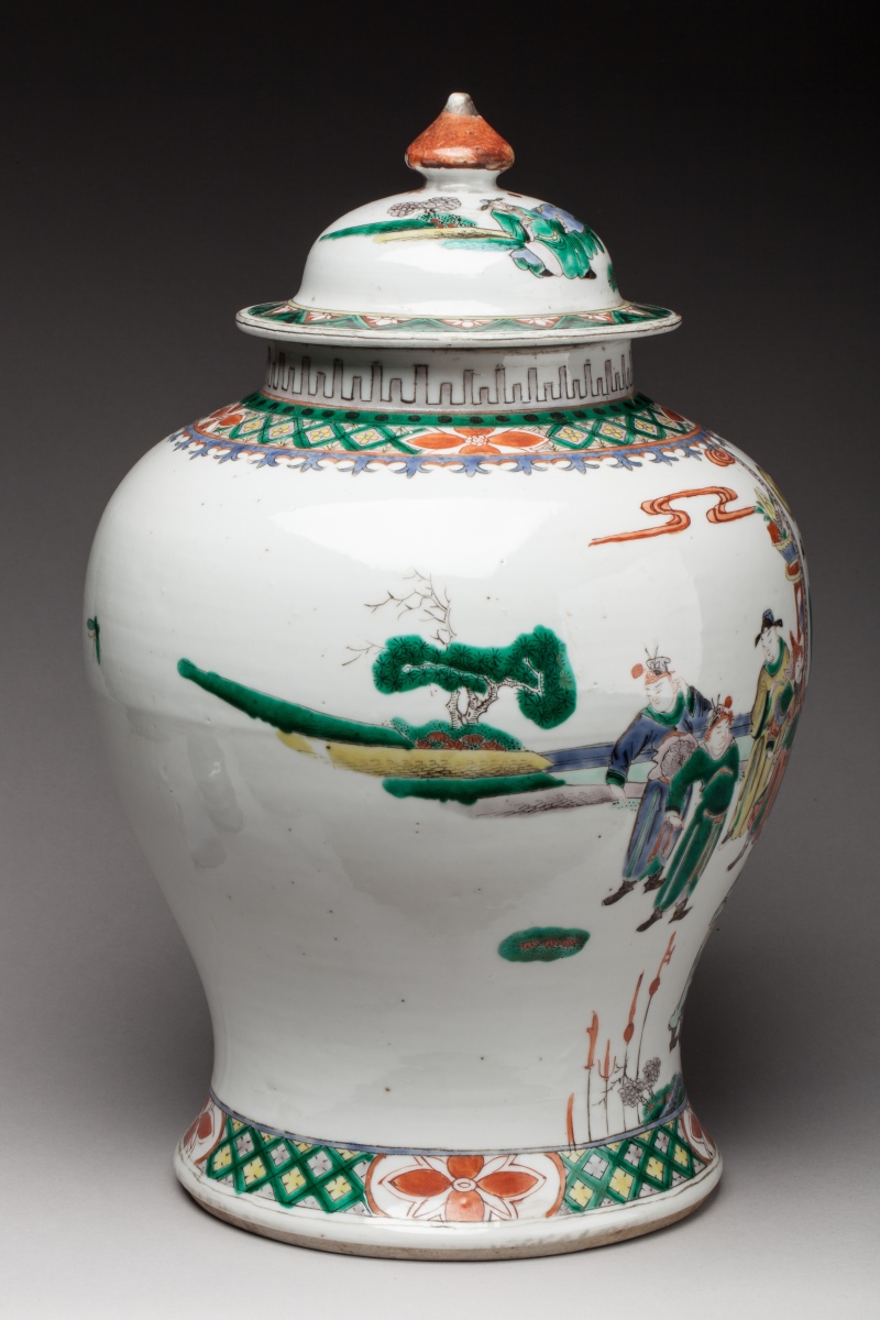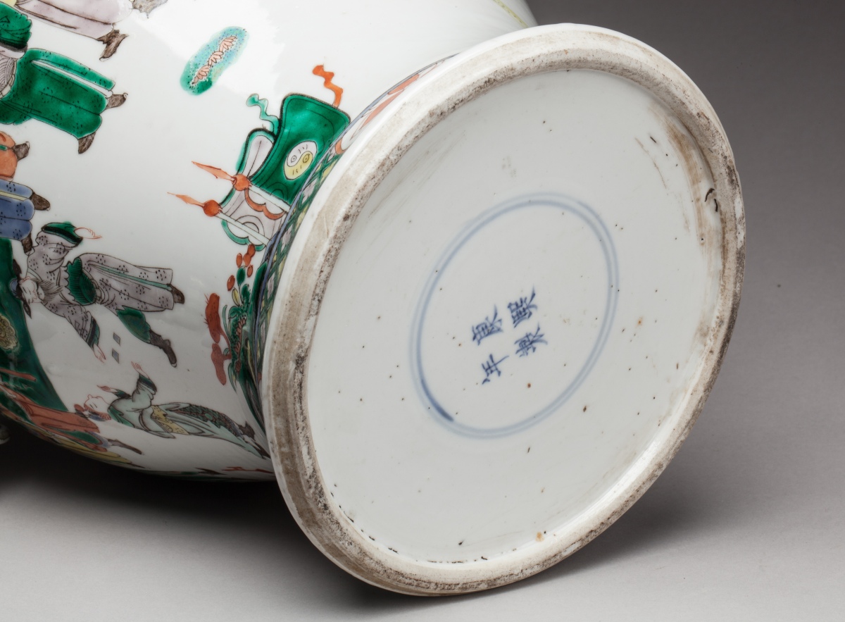 CHINE - Fin XIXe. POTICHE de forme balustre en porcelaine à fond blanc à décor polychrome d'une scène de palais et rochers. Cachet en bleu sous couverte.