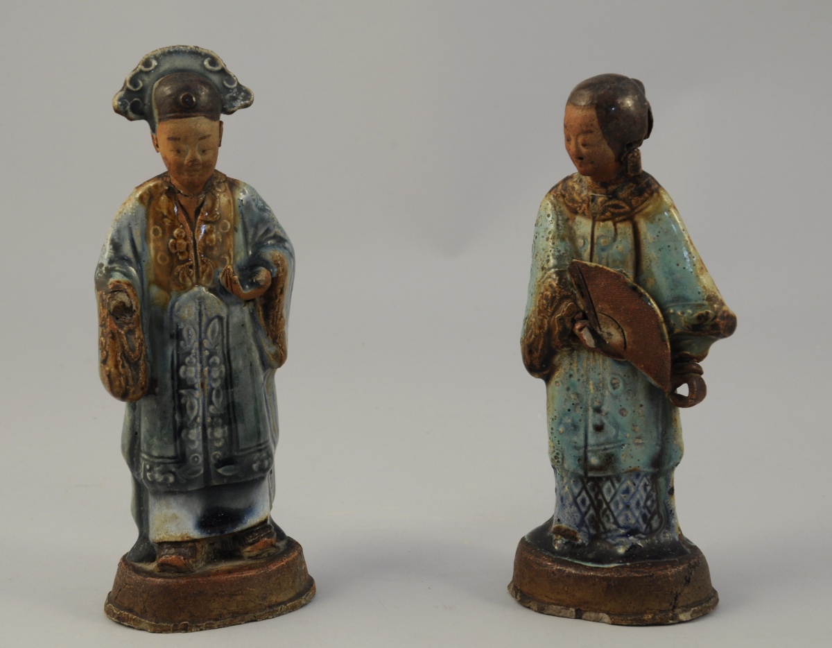 CHINE - XIX-XXe. COUPLE en terre cuite à décor d'engobe et glaçure bleu et brune.
