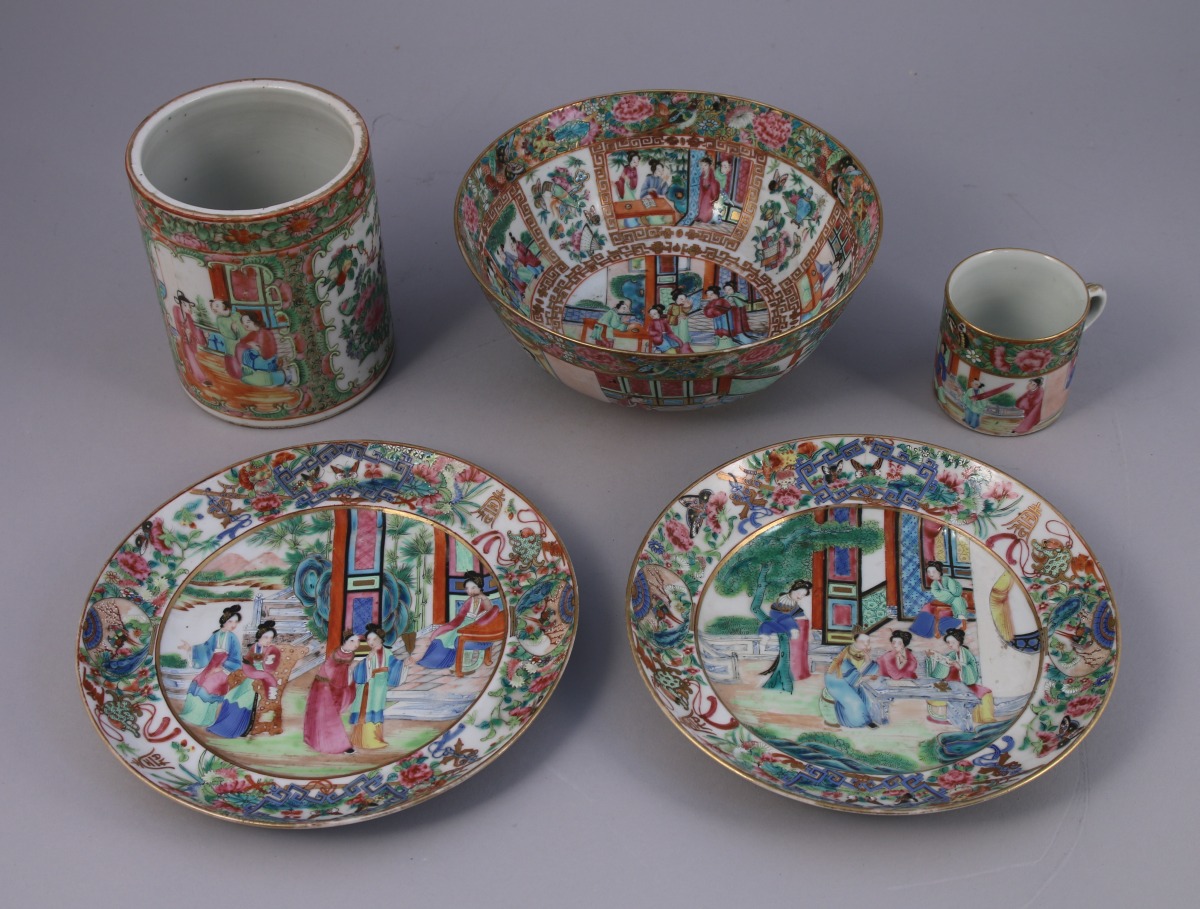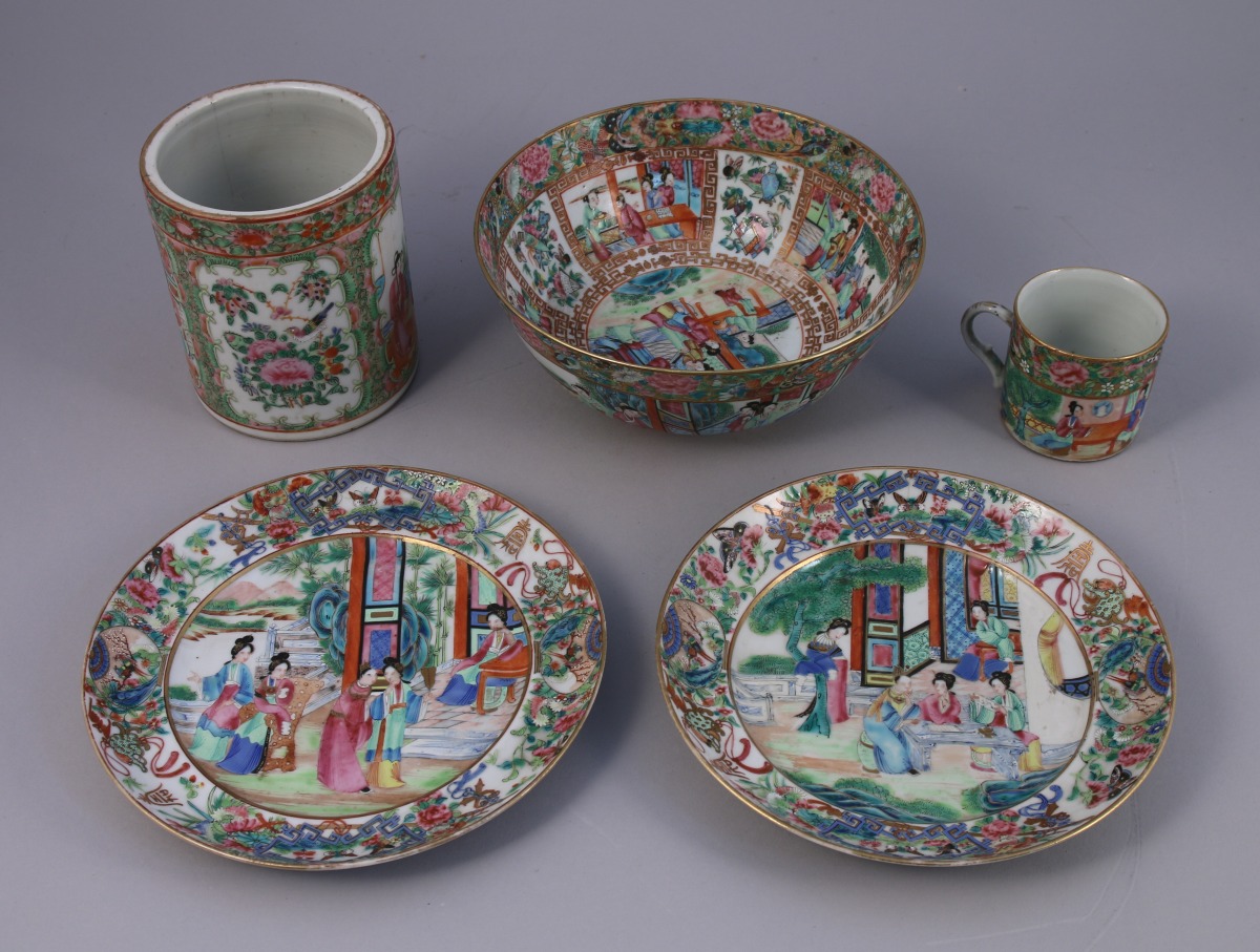 CHINE - CANTON - XIX-XXe. RÉUNION de CINQ PORCELAINES à décor polychrome et or: POT-À-PINCEAUX (Haut. 12,5, Diam. 11 cm); BOL (diam. 20 cm); deux assiettes (diam. 20 cm) et une TASSE-À-CAFÉ (haut. 6 cm). (en l'état)