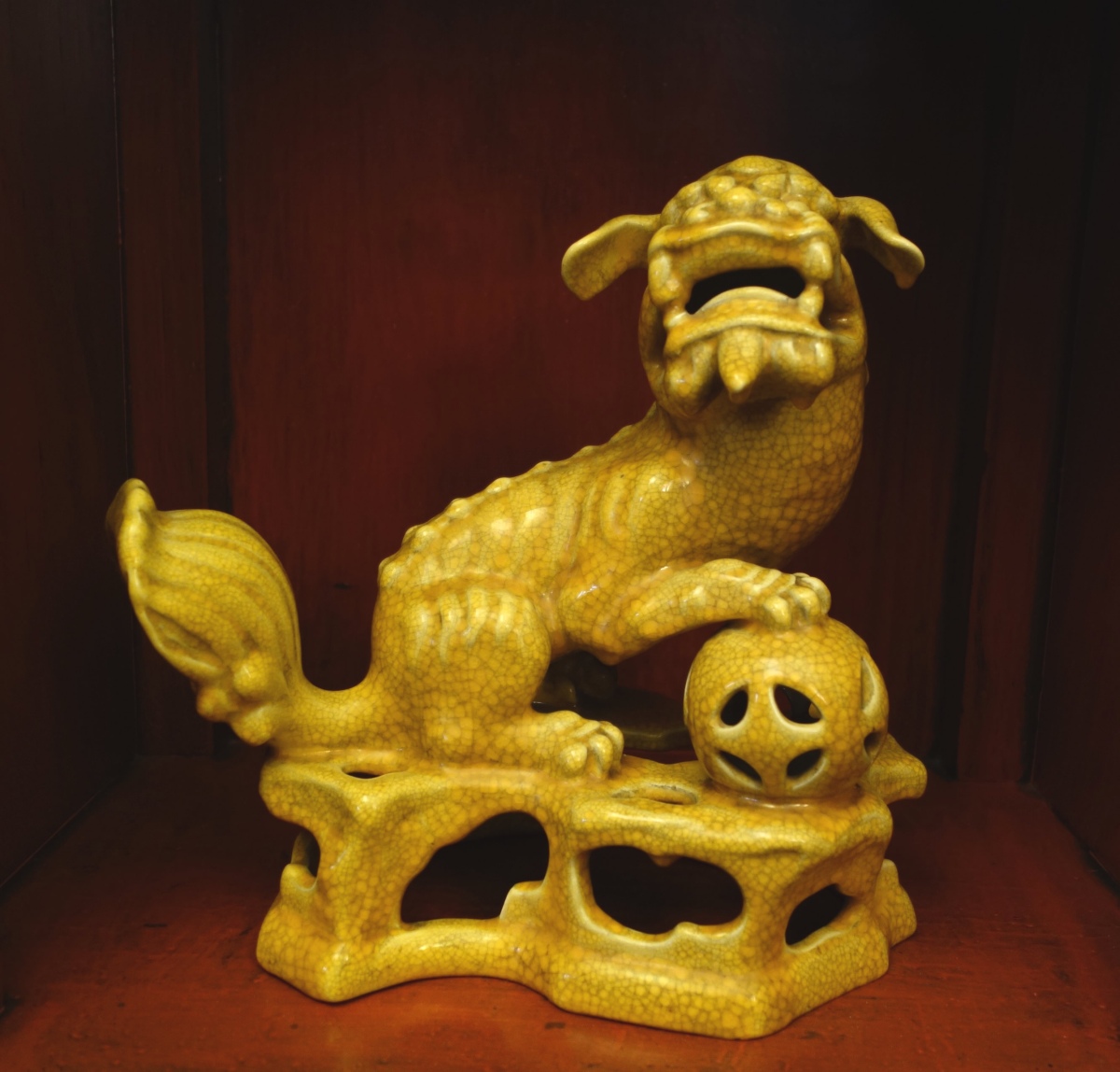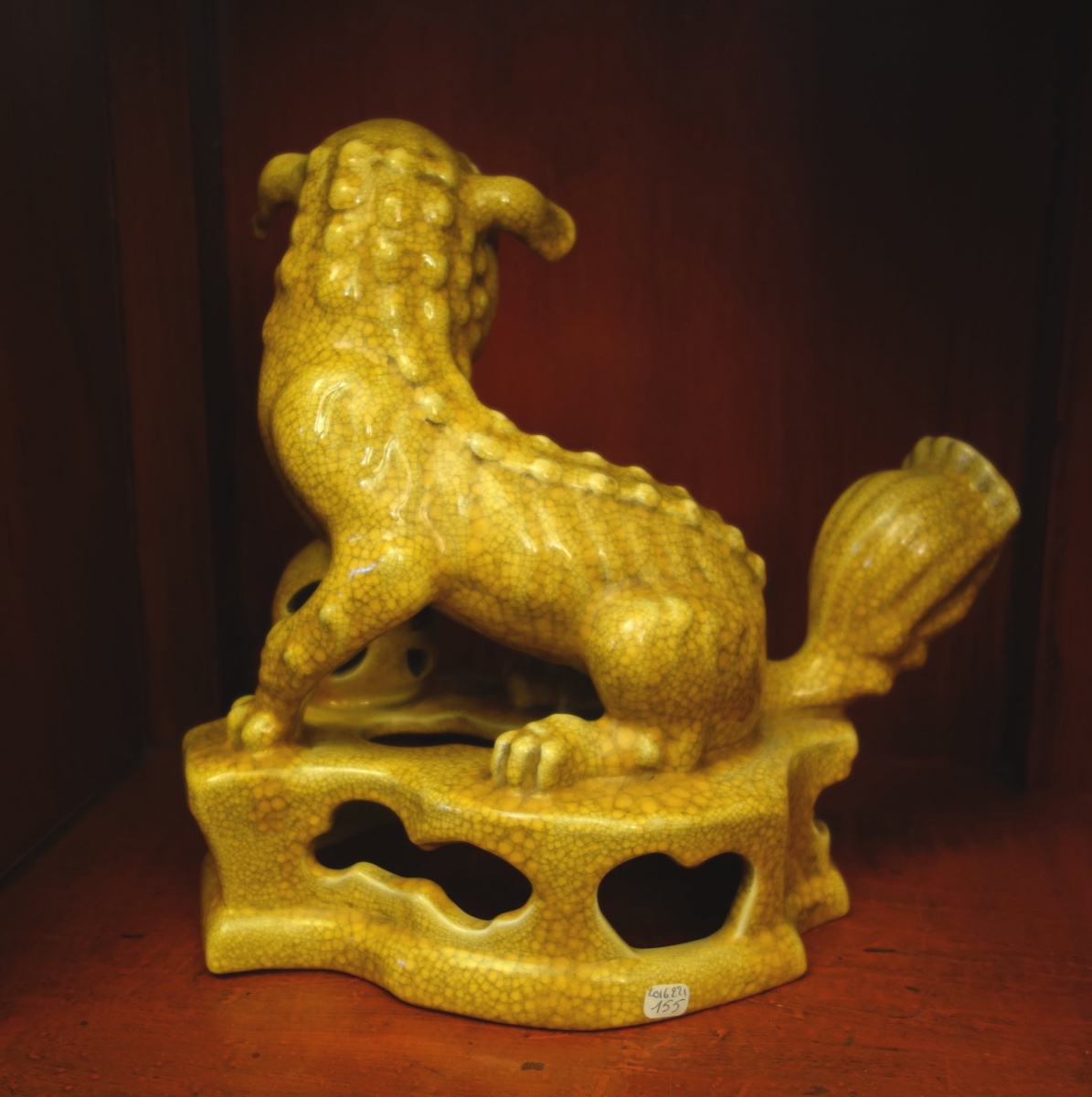 CHINE. CHIEN de PHÔ en céramique craquelée jaune.