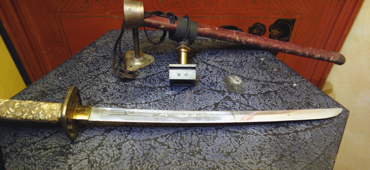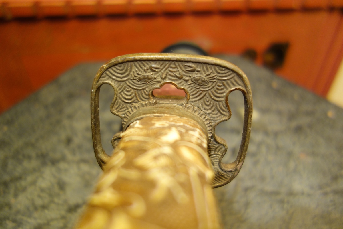 JAPON. KATANA, poignée en os sculpté en bas-relief de chasseurs à cheval, tsuba en bronze orné de poissons. Dans son fourreau en cuir bordeaux.