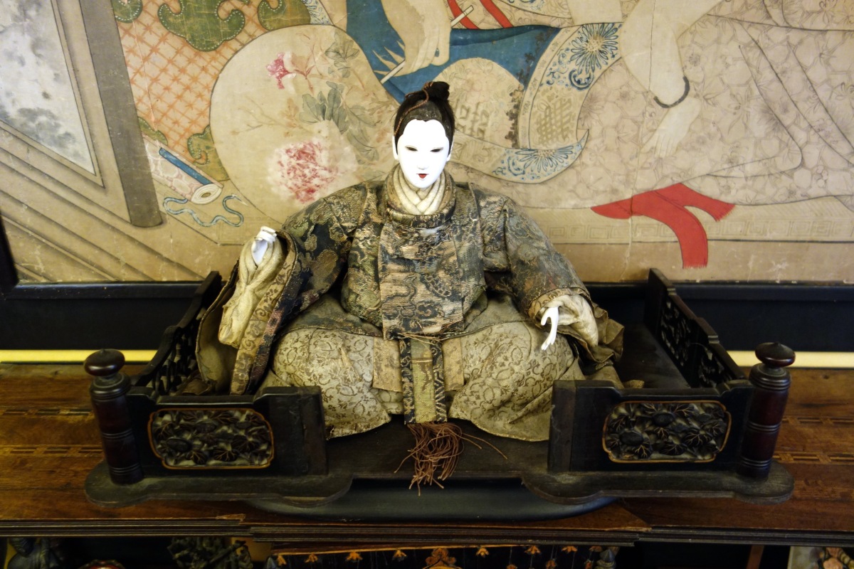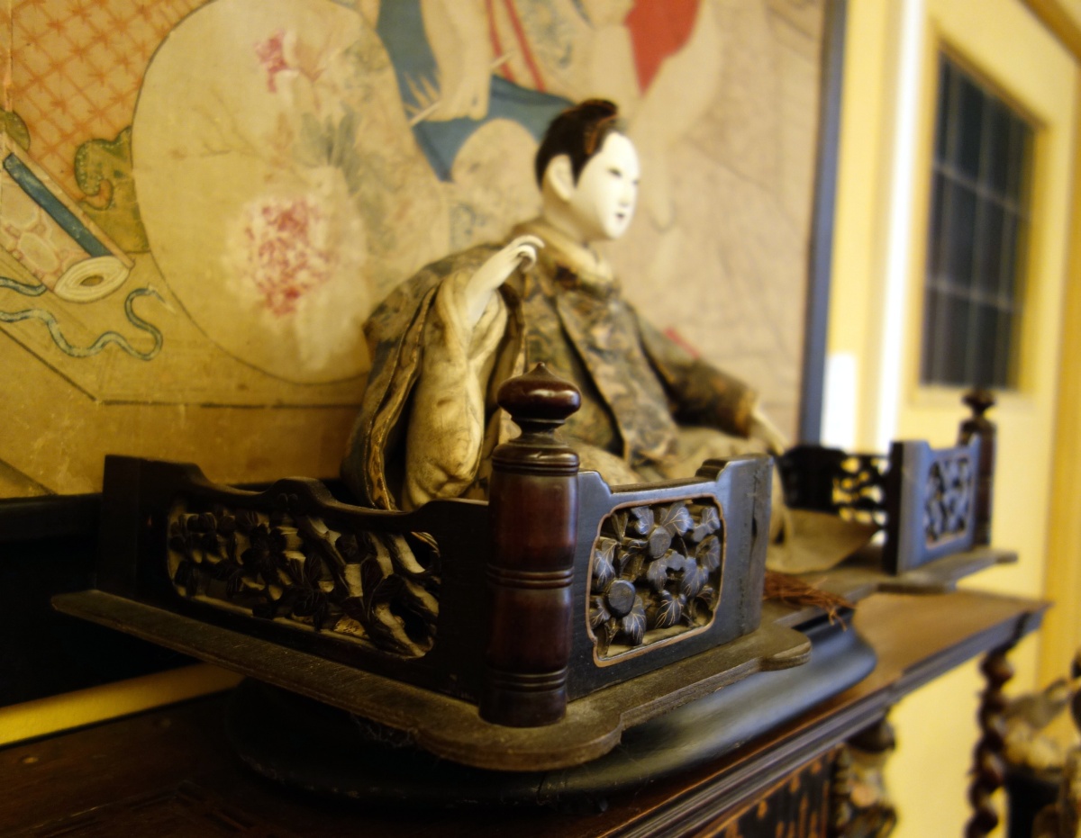 JAPON. POUPÉE représentant un DIGNITAIRE assis en bois laqué et tissu, sur une terrasse en bois sculpté et ajouré.