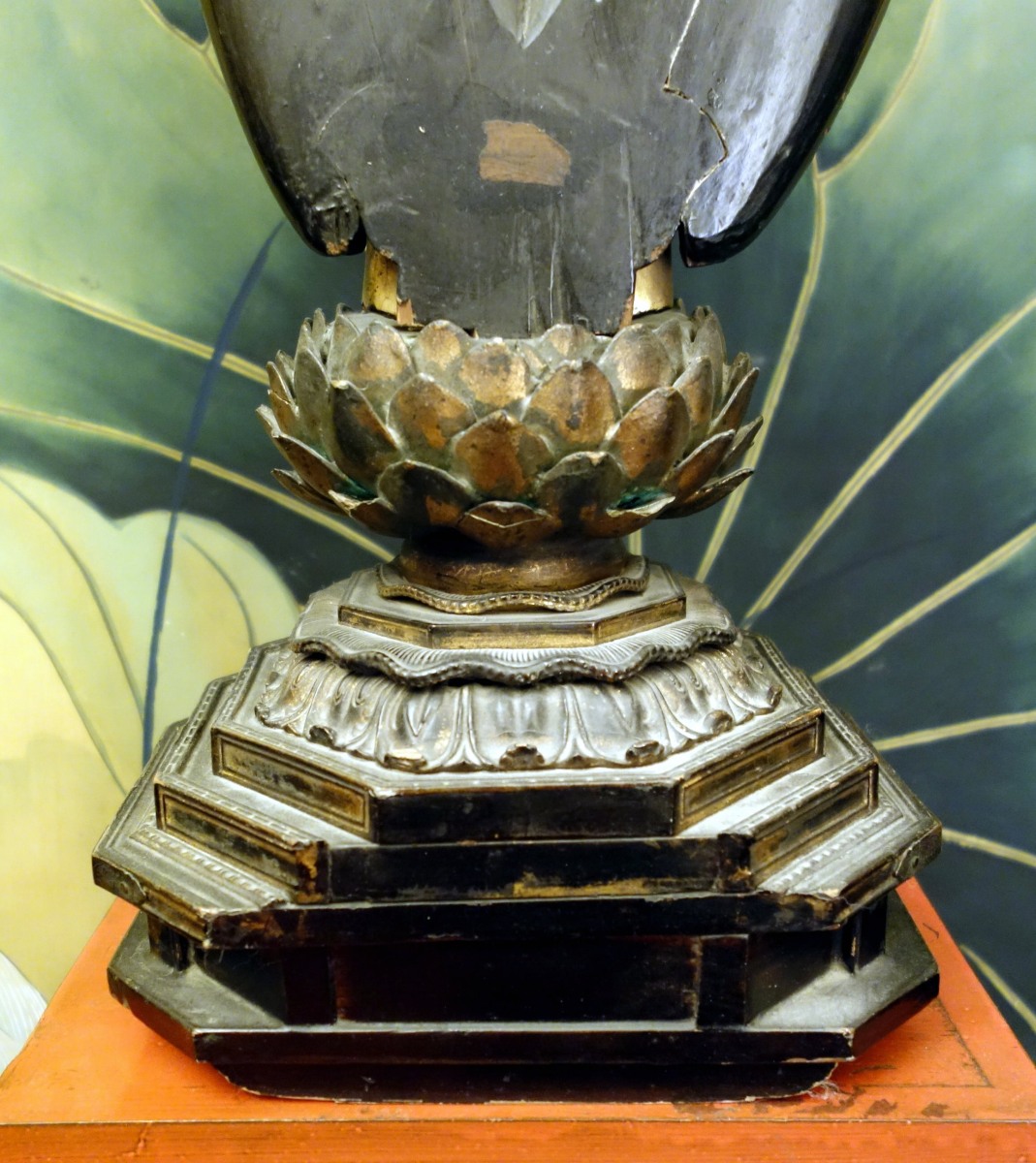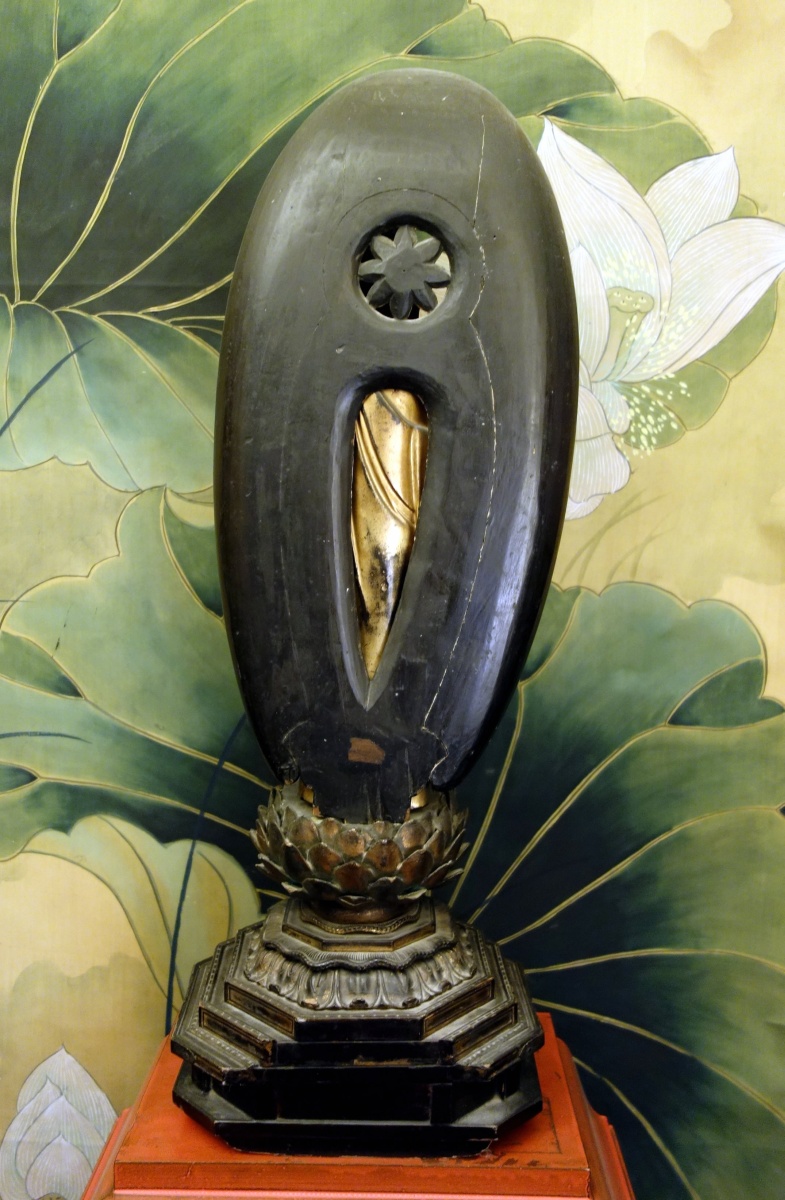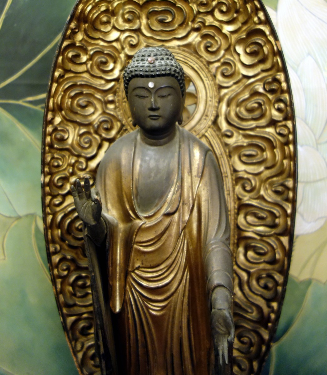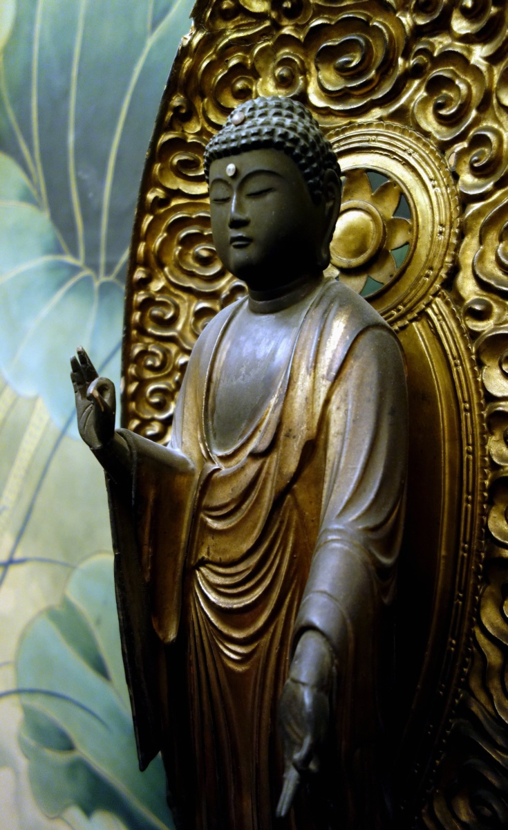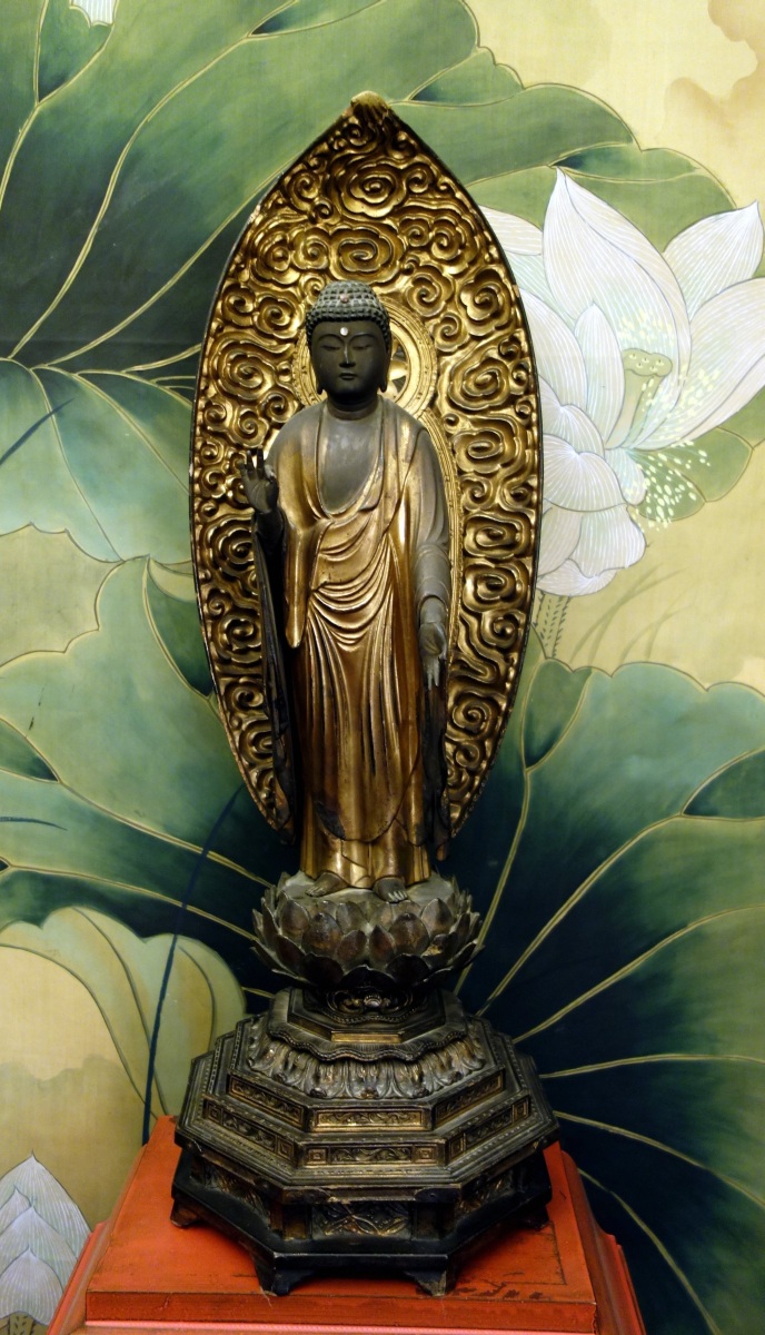 JAPON - Fin Époque Edo (1603 - 1868). Statuette de BOUDDHA en laque or debout sur le lotus devant sa mandorle, les mains en vitarka mudra (geste de l'enseignement).