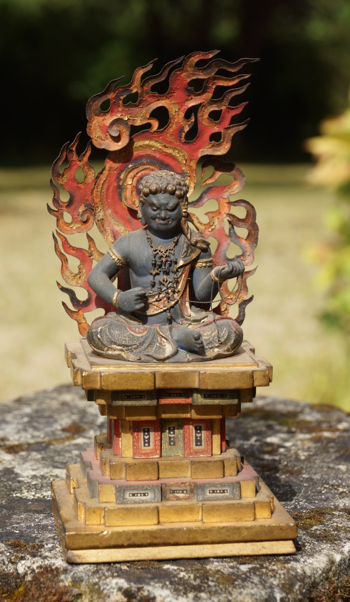 JAPON - Époque Edo (1603 - 1868). STATUETTE en bois sculpté laqué polychrome et doré de FUDO NYO assis devant une mandorle.