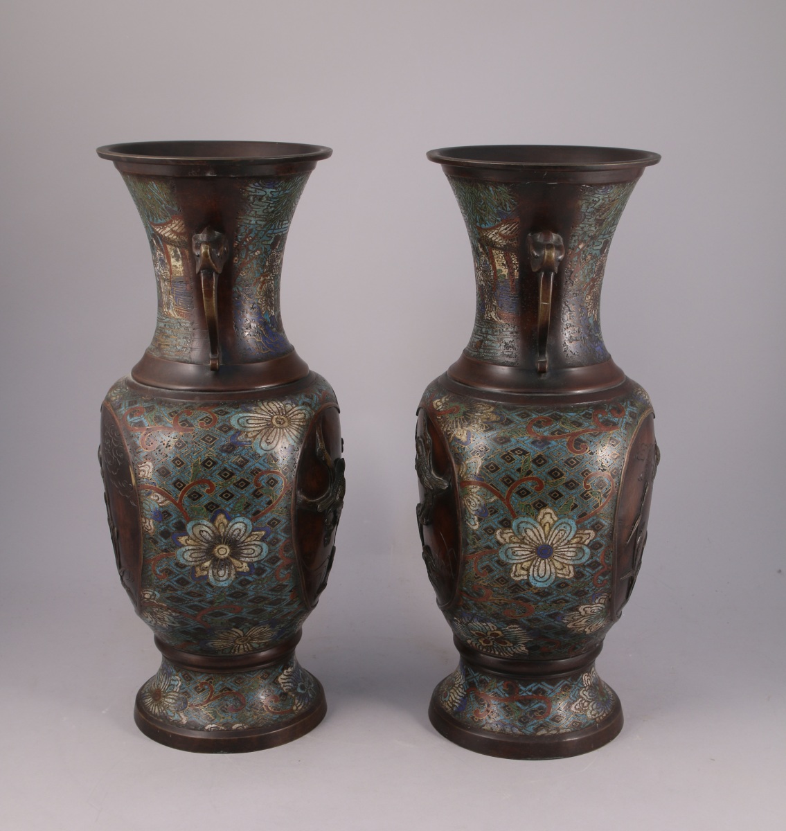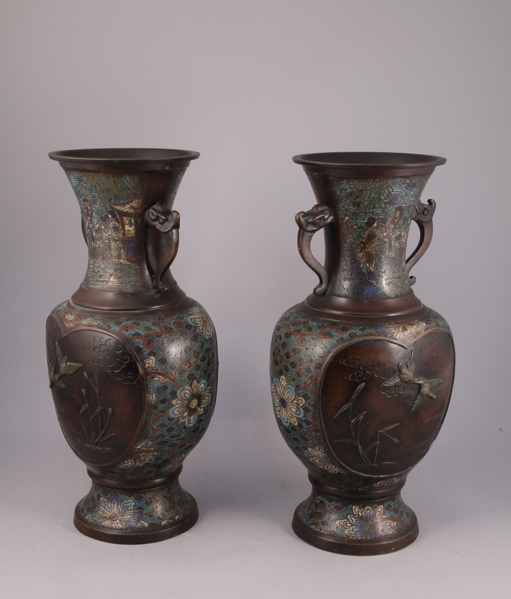 JAPON - Vers 1900. Paire de VASES en bronze à décor d'émaux cloissonnés de personnages et de feuillages. Panse en bas-relief ornée d'oiseaux dans des branchages, les anses à têtes d'éléphants stylisés. Cachet sous la base.
