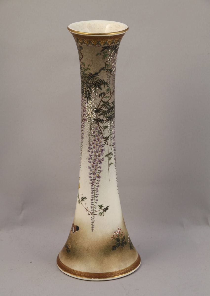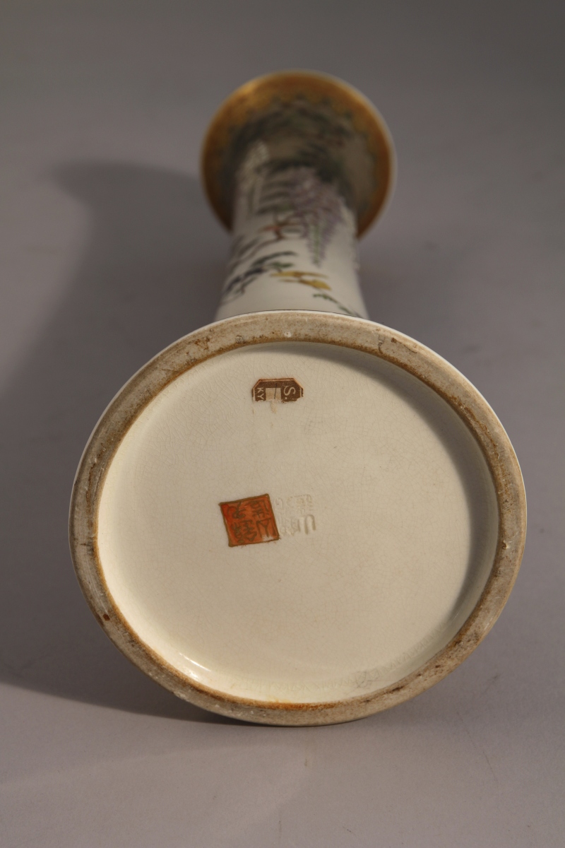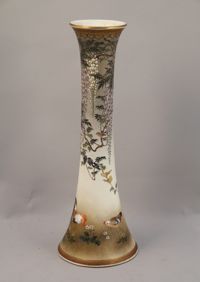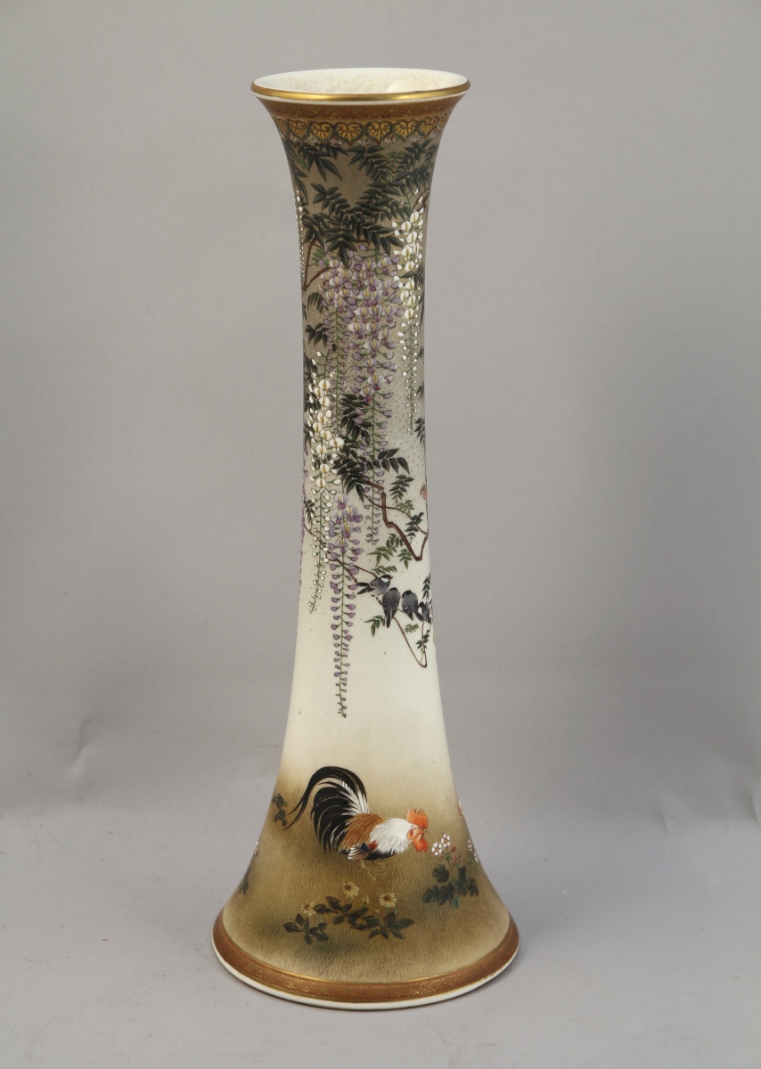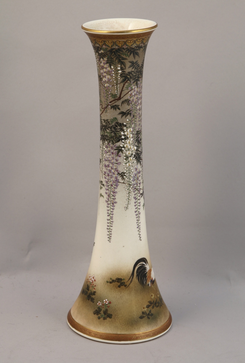 JAPON - SATSUMA. VASE cornet en porcelaine à riche décor polychrome et or de passereaux branchés dans une glycine en fleurs, coq et poule. Marques.