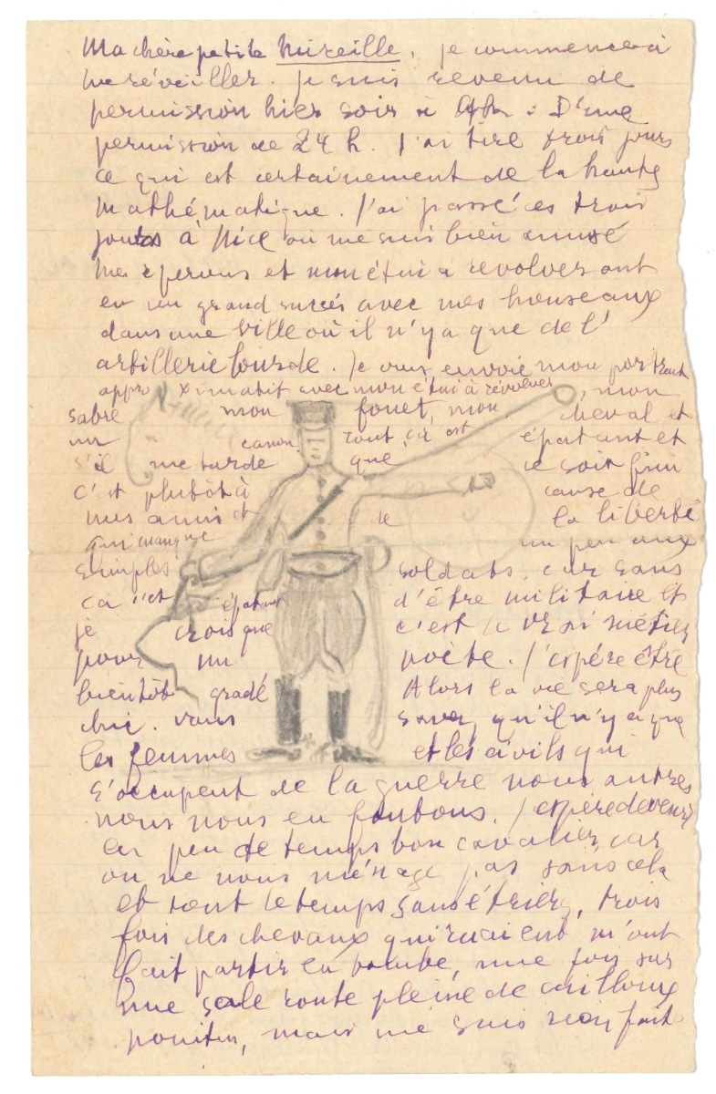 Il revient de permission de trois jours à Nice où il s'est " bien amusé " (il y avait retrouvé Louise de Coligny, " Lou "). " Mes éperons et mon étui à revolver ont eu un grand succès avec mes houseaux dans une ville où il n'y a que de l'artillerie lourde. Je vous envoie mon portrait approximatif avec mon étui à revolver, mon sabre, mon fouet, mon cheval et un canon. Tout ça est épatant et s'il me tarde que ce soit fini, c'est plutôt à cause de mes amis et de la liberté qui manque un peu aux simples soldats, car sans ça c'est épatant d'être militaire et je crois que c'est un vrai métier pour un poète. J'espère être bientôt gradé. Alors la vie sera plus chic. Vous savez qu'il n'y a que les femmes et les civils qui s'occupent de la guerre, nous autres nous nous en foutons. J'espère devenir en peu de temps bon cavalier, car on ne nous ménage pas sans cela et tout le temps sans étrier, trois fois des chevaux qui ruaient m'ont fait partir en bombe, une fois sur une sale route pleine de cailloux pointus, mais me suis rien fait. Tout de même faut être solide ici. Mais à la caserne on ne s'embête pas, pas de temps pour cela. Je deviens d'une brutalité merveilleuse. L'autre jour en promenade le cheval de mon voisin a rué et cassé la jambe au jeune homme qui me suivait, ça ne m'a causé aucune émotion. Je crois qu'après la guerre, il faudra pas que des poilus m'em