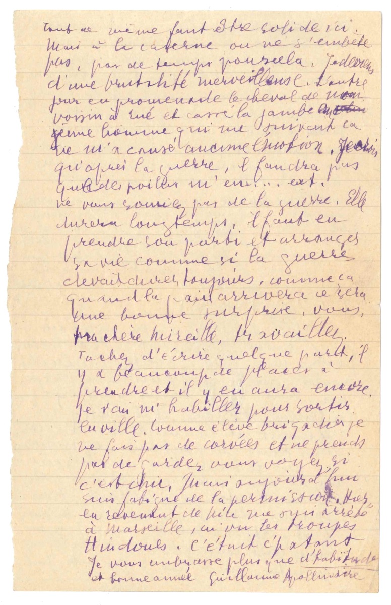 .ent. Ne vous souciez pas de la guerre. Elle durera longtemps, il faut en prendre son parti et arranger sa vie comme si la guerre devait durer toujours, comme ça quand la paix arrivera ce sera une bonne surprise. Vous, ma chère Mireille, travaillez. Tâchez d'écrire quelque part, il y a beaucoup de place à prendre et il y en aura encore ". Il va s'habiller " pour sortir en ville. Comme élève brigadier je ne fais pas de corvées et ne prends pas de garde, vous voyez si c'est chic "... Sur son retour de Nice, il s'est arrêté à Marseille, où il a " vu les troupes Hindoues. C'était épatant. Je vous embrasse plus que d'habitude et bonne année ". Il signe: " Guillaume Apollinaire ".