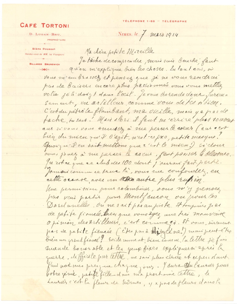 Guillaume APOLLINAIRE. L.A.S. " Guillaume " avec POEME, Nîmes " 7 mars 1914 " [pour 1915], à sa " chère petite Mireille " HAVET, " Le Colombier, Les Mées, Menars (Loir et Cher) " ; 1 page et demie in-4 à en-tête du Café Tortoni, enveloppe autographe signée " G. de Kostrowitzky ".