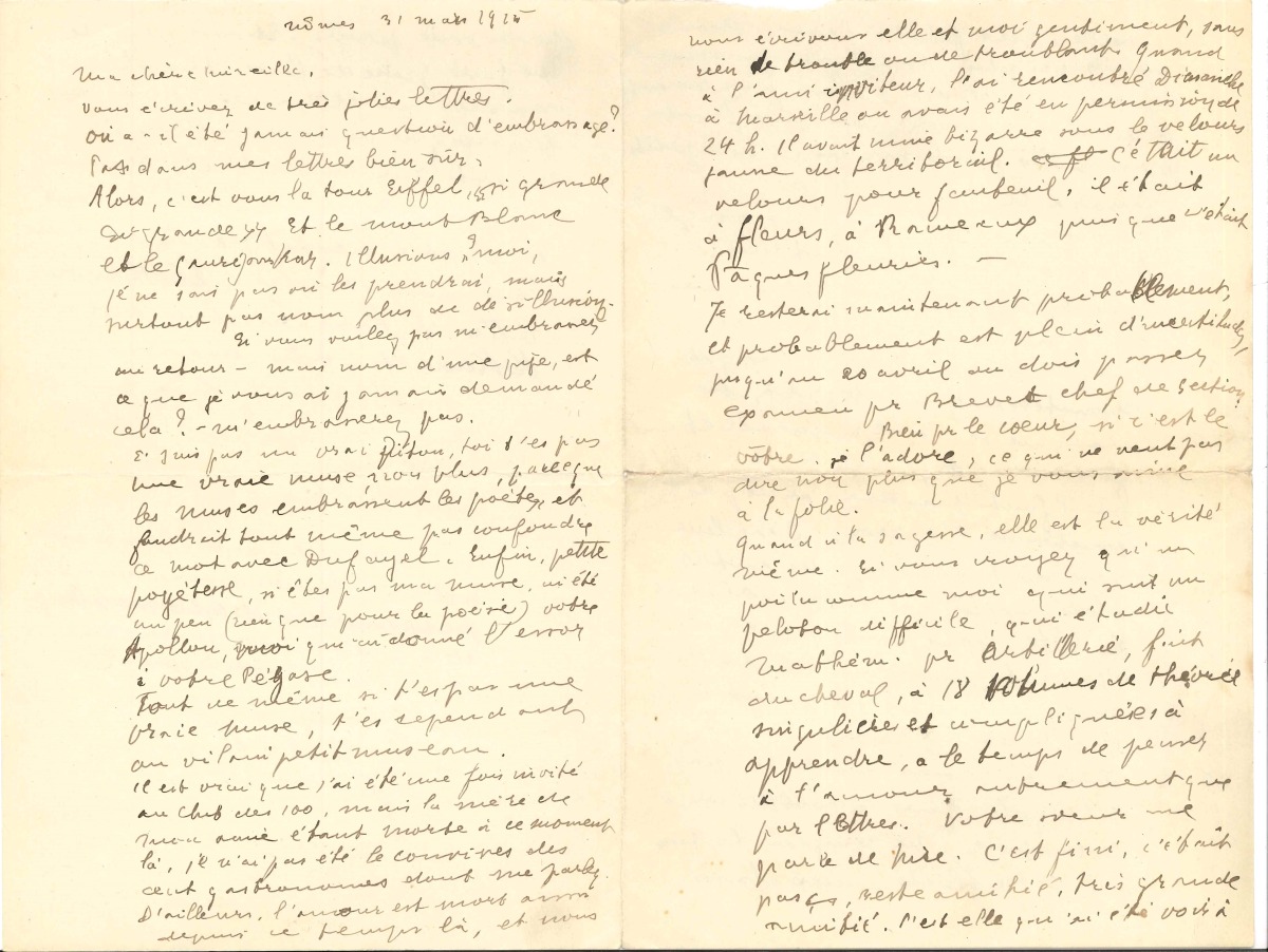 Bien pour le coeur, si c'est le vôtre, je l'adore, ce qui ne veut pas dire non plus que je vous aime à la folie. Quant à la sagesse, elle est la vérité même. Si vous croyez qu'un poilu comme moi qui suit un peloton difficile, qui étudie Mathéru pour artillerie, fait du cheval, a 18 volumes de théorie singulière et compliquée à apprendre, a le temps de penser à l'amour autrement que par lettres ". Quant à Nice [LOU]: " C'est fini, c'était pas ça, reste amitié, très grande amitié. [