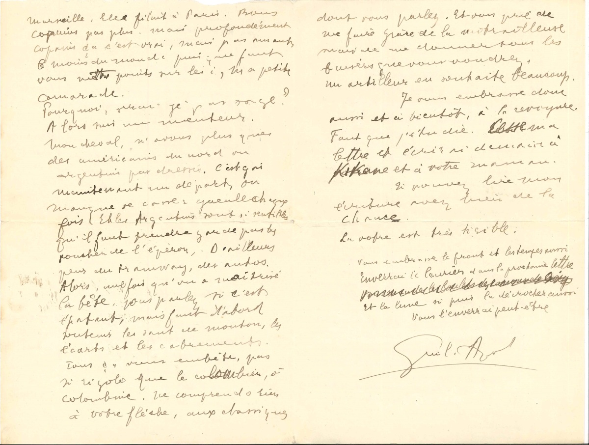 ] Bons copains pas plus, mais profondément copains ça c'est vrai, mais pas amants le moins du monde puisque faut vous mettre points sur les i, ma petite camarade. Pourquoi, serai-je pas sage? Alors suis un menteur. Mon cheval, n'avons plus que des américains du nord ou argentins pas dressés. C'est gai maintenant un départ, on manque se casser gueule chaque fois. Et les argentins sont si sensibles qu'il faut prendre garde pas les toucher de l'éperon. D'ailleurs, peur du tramway, des autos. Alors, une fois qu'on a maîtrisé la bête, vous parlez si c'est épatant, mais faut d'abord soutenir les sauts de mouton, les écarts et les cabrements. Tout ça vous embête, pas si rigolo que le colombier à Colombine. Ne comprends rien à votre flèche, aux classiques dont vous parlez. Et vous prie de me faire grâce de la mitrailleuse mais de me donner tous les baisers que vous voudrez, un artilleur en souhaite beaucoup. Je vous embrasse donc aussi et à bientôt, à la revoyure "...