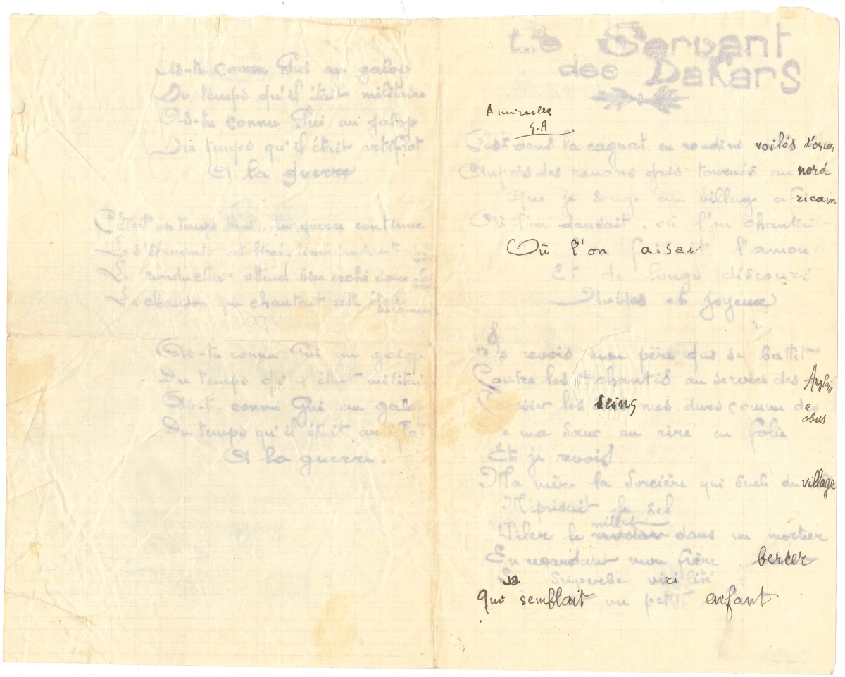 Le Servant des Dakars occupe les deux autres pages du feuillet, et les deux premières pages du feuillet suivant, soit 4 pages au lieu de 2 pages dans Case d'armons, où l'ordre des strophes sera modifié, et des variantes textuelles introduites. En tête du poème, Apollinaire a inscrit à l'encre noire la dédicace: " A Mireille G.A. ", et repassé à l'encre noire une vingtaine de mots peu lisibles. Le titre deviendra Les Soupirs du servant de Dakar dans l'édition de Calligrammes.