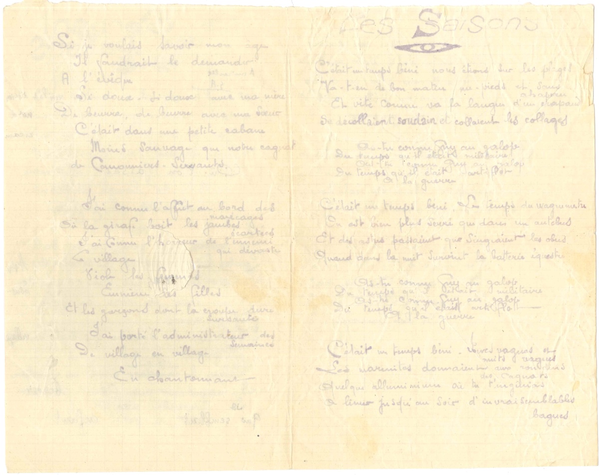TRES RARES FEUILLETS D'EPREUVES, probablement uniques, d'une maquette préparatoire avant le tirage de juin 1915 de Case d'armons, polygraphiés par gélatine à l'encre violette sur papier quadrillé, avec des VARIANTES, rassemblant les poèmes Les Saisons, Le Servant des Dakars et La Nuit d'Avril 1915, recueillis en 1918 dans Calligrammes.