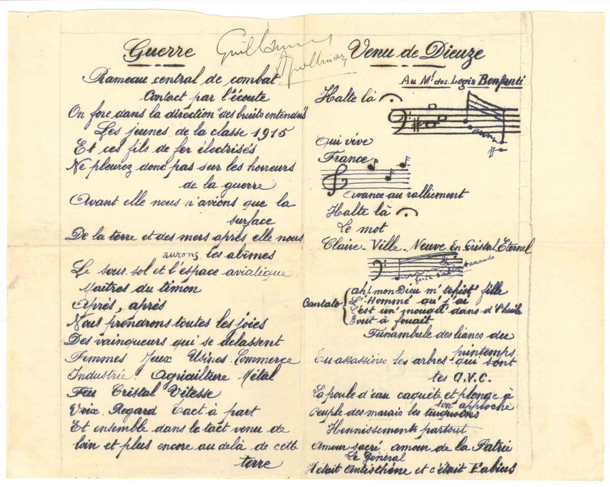 Ce feuillet a été envoyé (il porte la trace des plis pour être glissé dans l'enveloppe) à Mireille Havet, qui en accuse réception le 28 juin 1915: " vos deux poèmes, cher Apollon, que j'ai beaucoup aimés. Surtout le Guerre. Mais l'autre est chic je trouve à regarder comme impression d'ensemble. Et puis je les aime je crois autant tous les deux, et vraiment je vous admire de faire cela dans des conditions aussi réfractaires ".