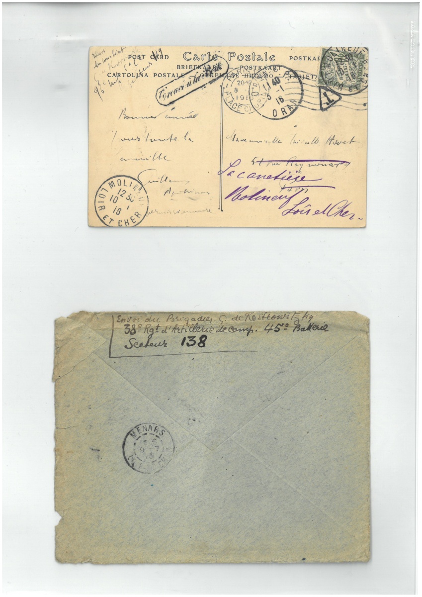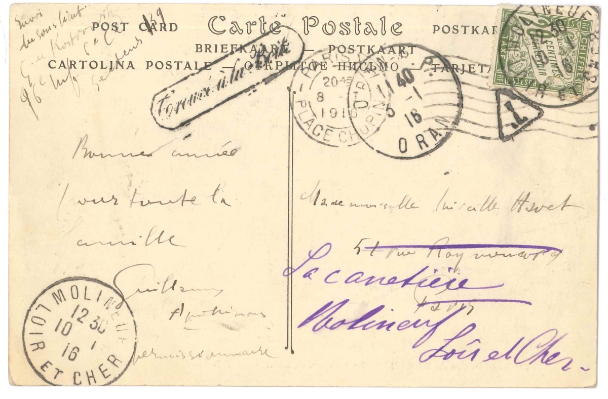 " Envoi du sous lieut. G. de Kostrowitzky 96e Inf. 6e Cie Secteur 139. Bonne année pour toute la famille Guillaume Apollinaire permissionnaire " [il était alors à Oran avec Madeleine Pagès].
