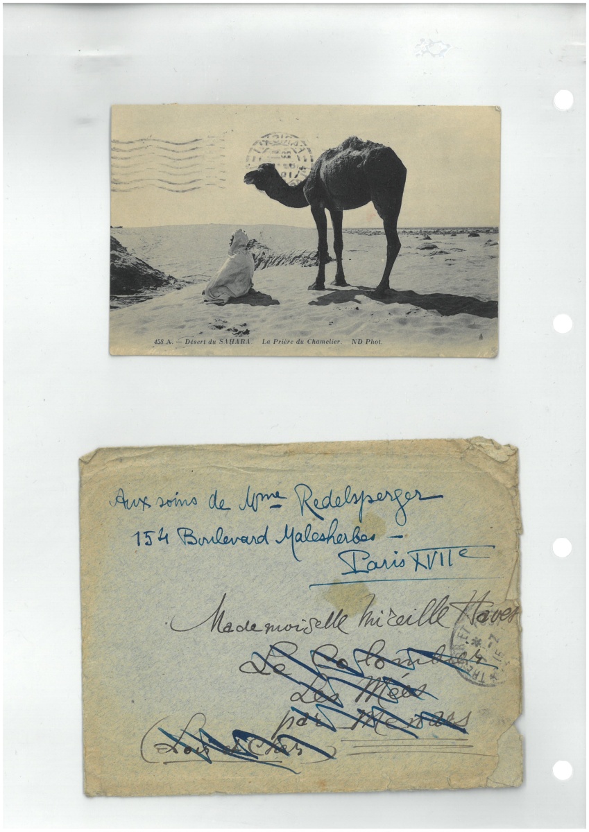 Guillaume APOLLINAIRE. Carte postale autographe signée, [Oran 3 janvier 1916], à Mlle Mireille HAVET, 51 rue Raynouard à Paris ; carte postale illustrée (Désert du Sahara. La Prière du Chamelier), texte et adresse au dos, avec timbre et 5 cachets postaux.