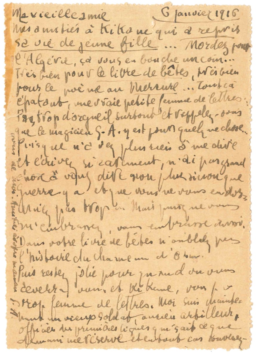 " Ma vieille amie Mes amitiés à Kikane qui a repris sa vie de jeune fille [le mari de Christiane, la sur de Mireille, était reparti au front]... Mordez pour l'Algérie, ça vous en bouche un coin... Très bien pour le livre de bêtes [La Maison dans l'il du chat, publiée en 1917, dont Colette écrira la préface], très bien pour le poème au Mercure [Adieu à la Touraine, parue dans le Mercure de France du 1er juin 1916]... Tout ça épatant, une vraie petite femme de lettres. Pas trop d'orgueil surtout et rappelez-vous que le magicien G. A. y est pour quelque chose. Puisque n'avez plus rien à me dire et écrivez si rarement, n'ai pas grand chose à vous dire non plus sinon que Guerre y a et que vous ne vous endormiez pas trop... Mais puisque vous m'embrassez, vous embrasse aussi. Dans votre livre de bêtes n'oubliez pas l'histoire du chameau d'Oran. Puis restez jolie pour quand on vous reverra vous et Kikane, vous pas trop femme de lettres. Moi suis maintenant un vieux soldat, ancien artilleur, officier des premières lignes qui sait ce que demain me réserve et en tout cas souvenez-vous de moi "