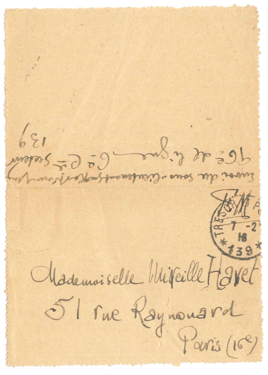 Guillaume APOLLINAIRE. L.A.S., 6 " janvier " [pour février] 1916, à Mlle Mireille HAVET, 51 rue Raynouard à Paris ; 1 page in-12, adresse au verso (petites fentes).