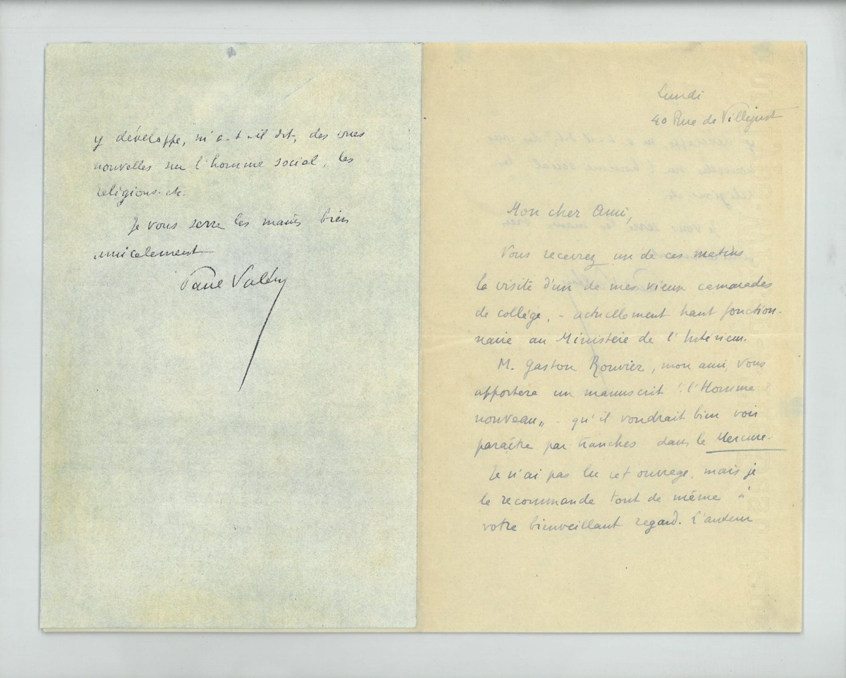 Il recommande un vieux camarade de collège, Gaston ROUVIER, haut fonctionnaire, qui aimerait publier son livre L'Homme nouveau dans la revue du Mercure de France ; il y développe " des vues nouvelles sur l'homme social, les religions etc. "