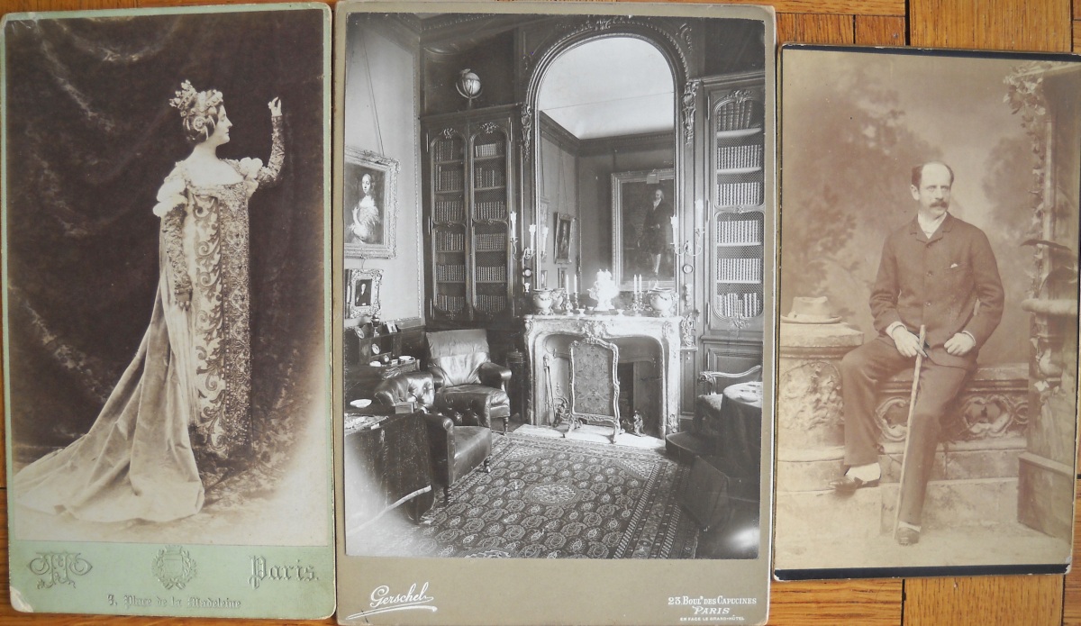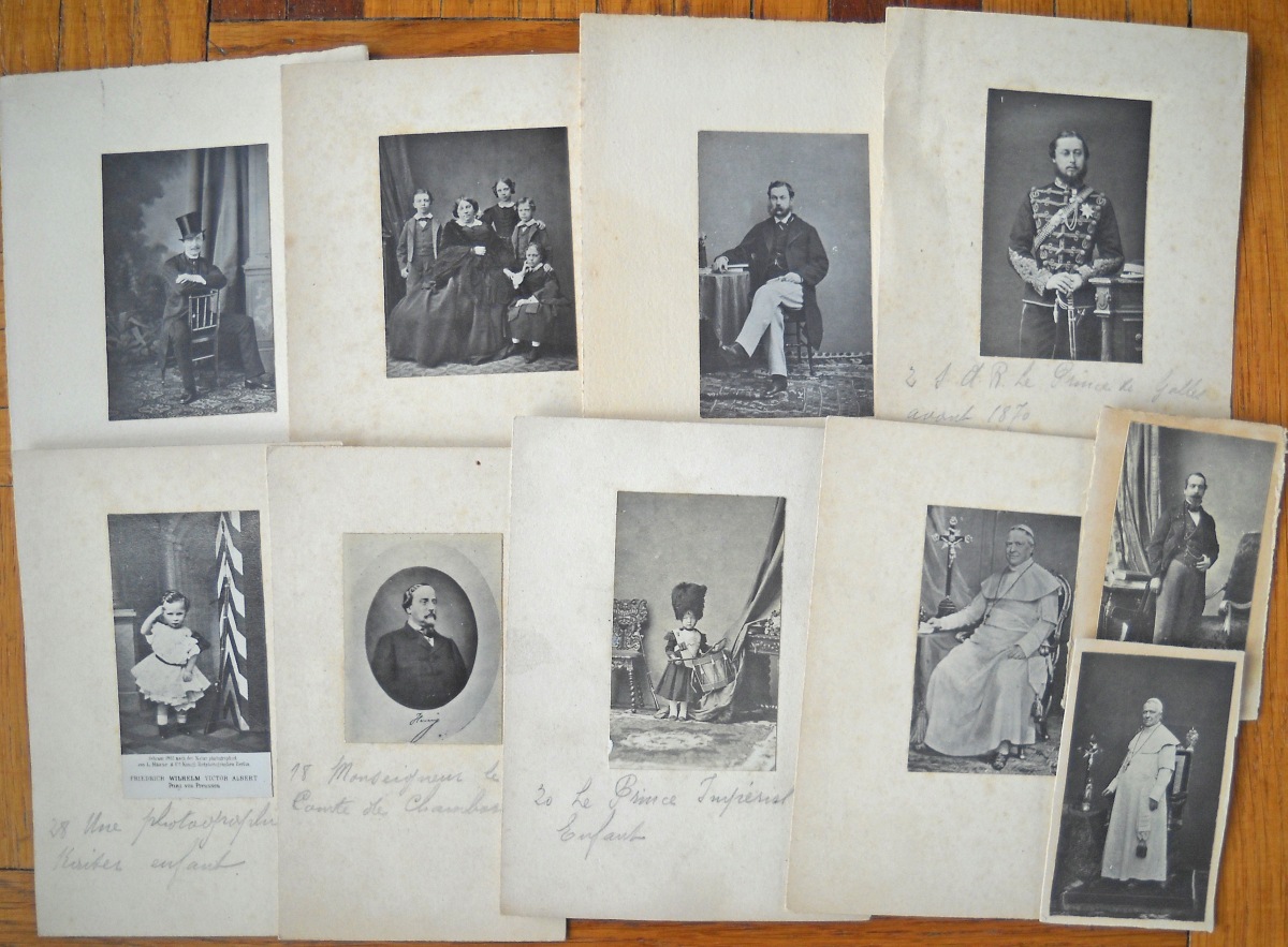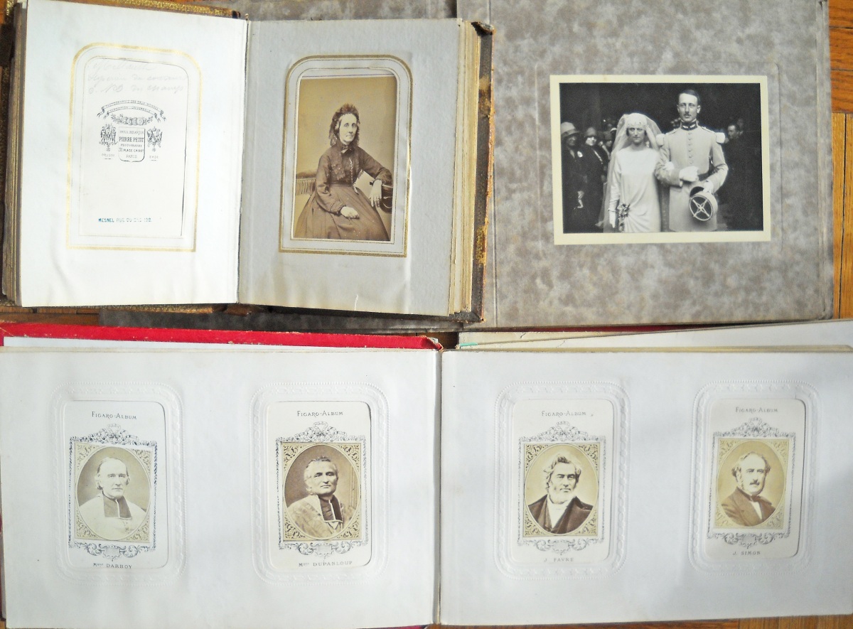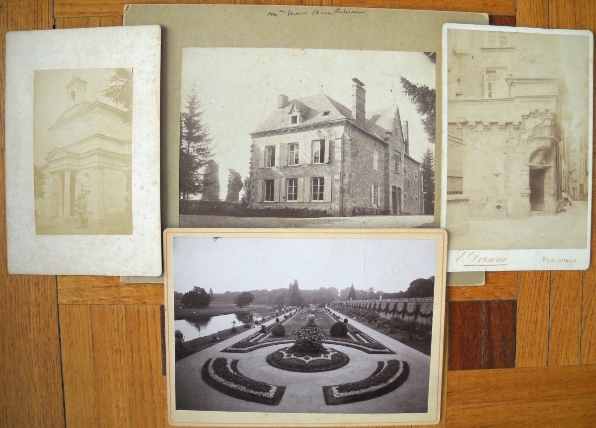 Chapelle de Rochecotte - château d'Aubijoux - Maison de Famille des Talleyrand à Périgueux - Château de Valençay sous la neige - Jardin du château du Lude - Calèches dans le parc de Chenonceau - environ une vingtaine de clichés représentant des tableaux et uvres d'art conservés au château de Villandry - 11 tirages format carte de visite de portraits de la famille impériale et personnages du Second Empire - " Figaro Album " (album en mauvais état, dérelié) regroupant environ 100 portraits photographiques, format carte de visite, représentant diverses personnalités de la Troisième République: Mac-Mahon, Général Uhrich, Gambetta, Génaral Trochu, Monseigneur Dupanloup, Arago, Emile de Girardin, George Sand, Alexandre Dumas, Dennery, Victorien Sardou, Gaboriau, Thiers, Rosa Bonheur, Gustave Courbet, Gustave Doré, Charles Garnier, André Gill, Listz, Gounod, Michelet, Princesse Metternich, Comtesse Pourtales, Ferdinand de Lesseps, Baron Haussmann, La Patti, Sarah Bernhardt, Marie-Laurent, Frédéric Lemaitre, Got, Delaunay, Faure, etc. Vers 1875. - petit album (en l'état) contenant 22 portraits photographiques, format carte de visite, 1860-1880. A identifier. - petit album de 12 clichés photographiques d'une cérémonie de mariage d'un officier Saint-Cyrien, années 1920-1930. - Album de 96 clichés photographiques de paysages et monuments pris par Emilio Terry lors de son voyage en Italie et en Suisse, vers 1900. - Env. 65 clichés photographiques de monuments et de paysages: Paris, Touraine, montagnes, etc. - Env. 70 tirages photographiques, 1880-1900, contrecollés sur carton, en mauvais état (pliures, déchirures), représentant des personnages (Pauline de Castellane, duchesse de Luynes, duc d'Ayen, comte de Puységur, roi de Naples, Abbé Seignan, duchesse de Bisaccia, etc) ainsi que des vues de monuments et de paysages en France et en Suisse. - etc.