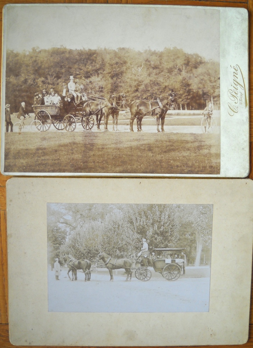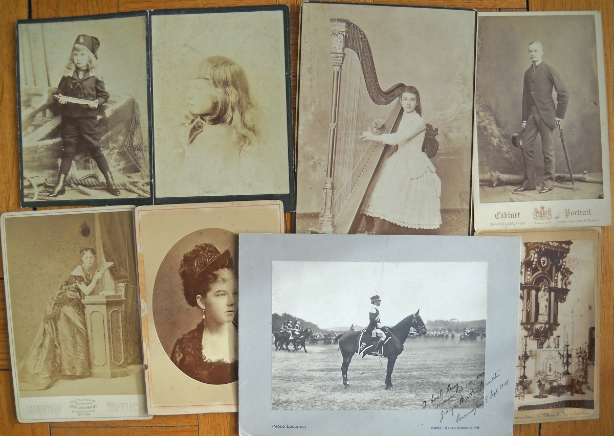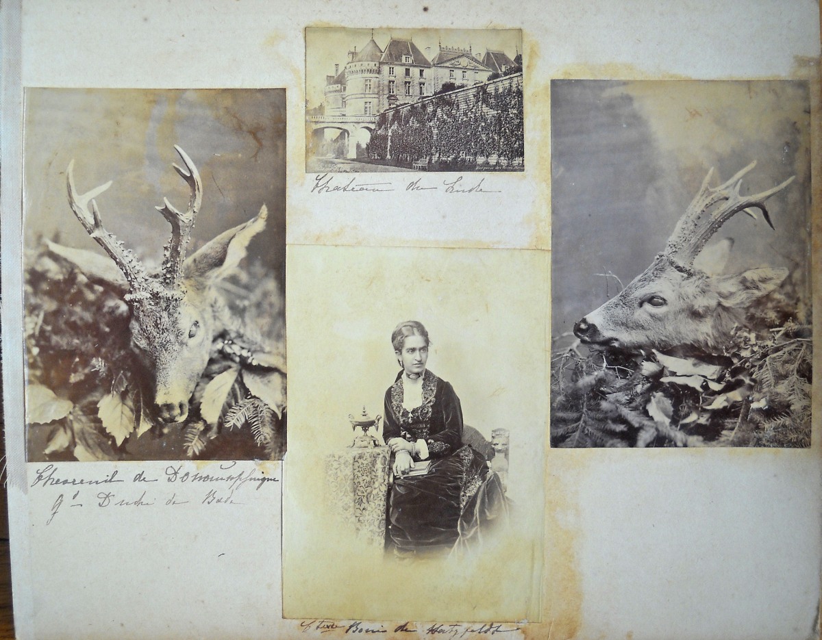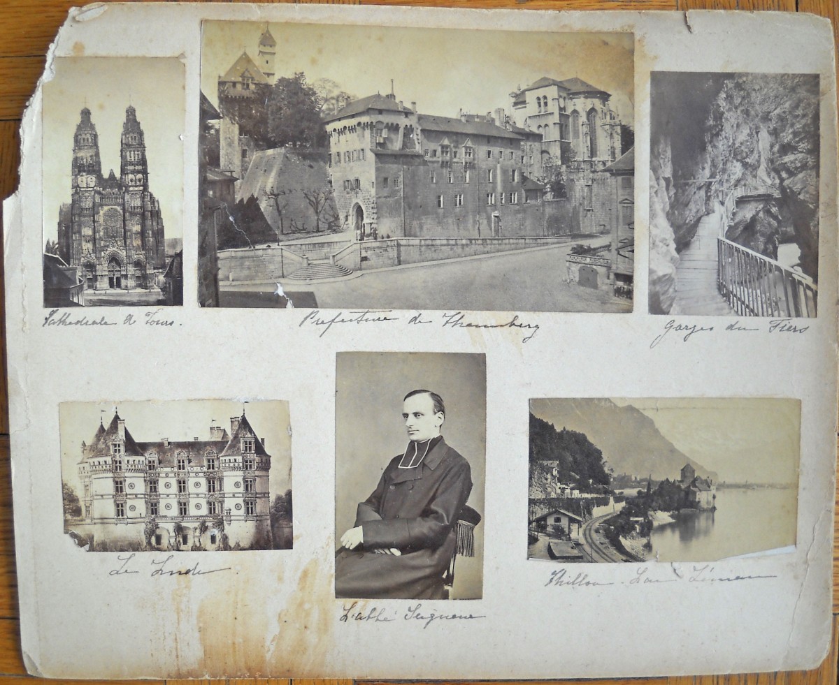 Chapelle de Rochecotte - château d'Aubijoux - Maison de Famille des Talleyrand à Périgueux - Château de Valençay sous la neige - Jardin du château du Lude - Calèches dans le parc de Chenonceau - environ une vingtaine de clichés représentant des tableaux et uvres d'art conservés au château de Villandry - 11 tirages format carte de visite de portraits de la famille impériale et personnages du Second Empire - " Figaro Album " (album en mauvais état, dérelié) regroupant environ 100 portraits photographiques, format carte de visite, représentant diverses personnalités de la Troisième République: Mac-Mahon, Général Uhrich, Gambetta, Génaral Trochu, Monseigneur Dupanloup, Arago, Emile de Girardin, George Sand, Alexandre Dumas, Dennery, Victorien Sardou, Gaboriau, Thiers, Rosa Bonheur, Gustave Courbet, Gustave Doré, Charles Garnier, André Gill, Listz, Gounod, Michelet, Princesse Metternich, Comtesse Pourtales, Ferdinand de Lesseps, Baron Haussmann, La Patti, Sarah Bernhardt, Marie-Laurent, Frédéric Lemaitre, Got, Delaunay, Faure, etc. Vers 1875. - petit album (en l'état) contenant 22 portraits photographiques, format carte de visite, 1860-1880. A identifier. - petit album de 12 clichés photographiques d'une cérémonie de mariage d'un officier Saint-Cyrien, années 1920-1930. - Album de 96 clichés photographiques de paysages et monuments pris par Emilio Terry lors de son voyage en Italie et en Suisse, vers 1900. - Env. 65 clichés photographiques de monuments et de paysages: Paris, Touraine, montagnes, etc. - Env. 70 tirages photographiques, 1880-1900, contrecollés sur carton, en mauvais état (pliures, déchirures), représentant des personnages (Pauline de Castellane, duchesse de Luynes, duc d'Ayen, comte de Puységur, roi de Naples, Abbé Seignan, duchesse de Bisaccia, etc) ainsi que des vues de monuments et de paysages en France et en Suisse. - etc.