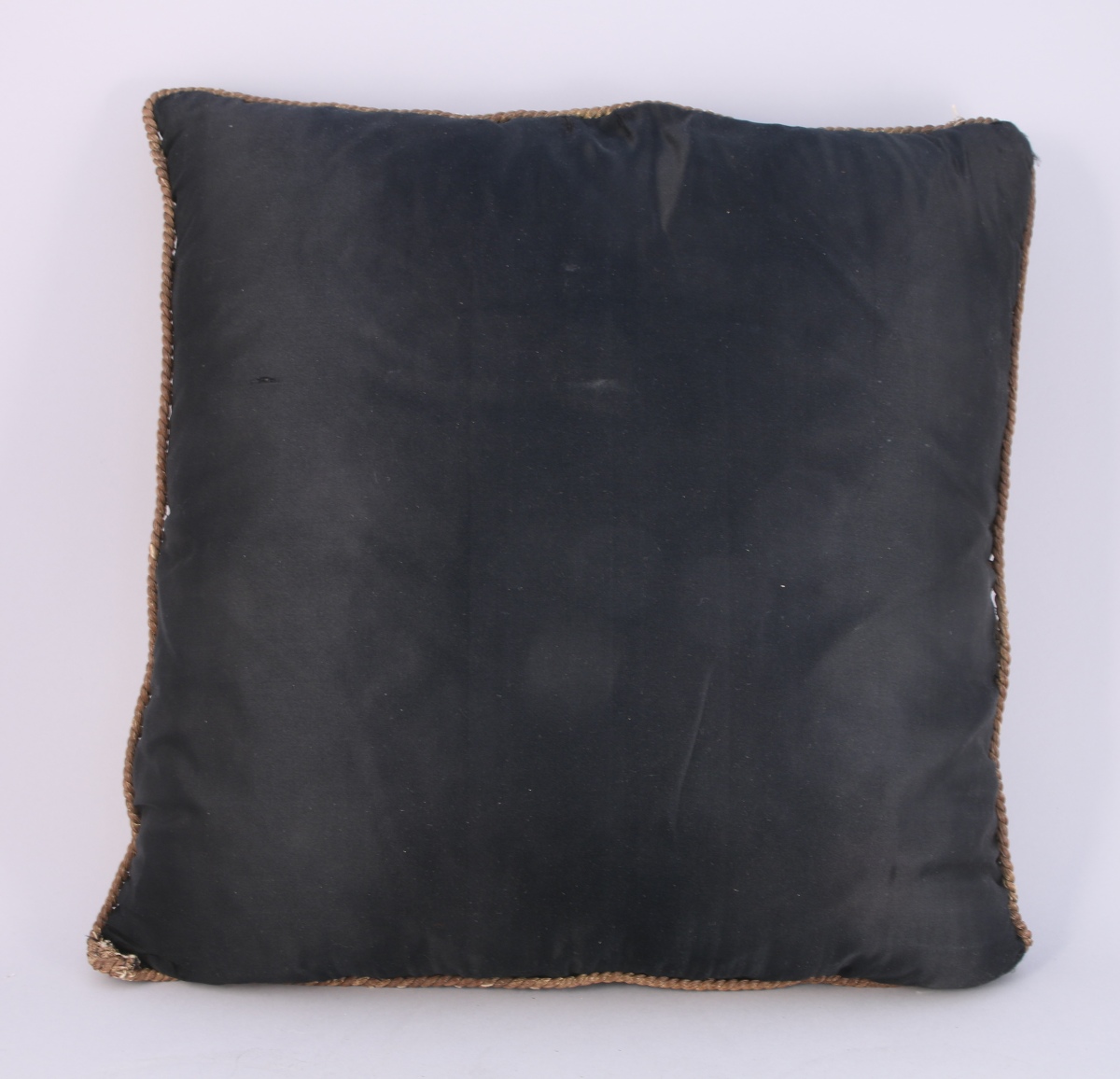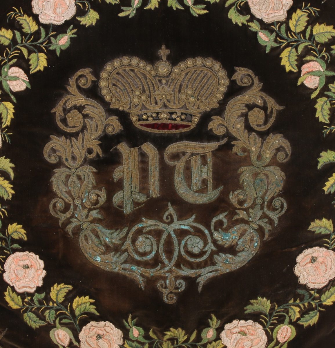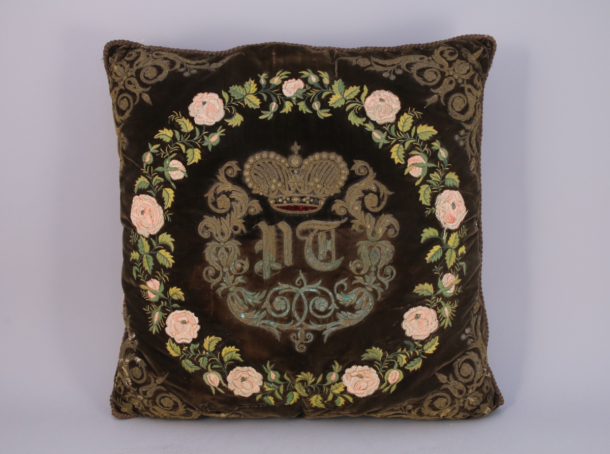 COUSSIN d'APPARAT en velours vert brodé de fils d'argent et de soie. Le décor central au monogramme des Princes de Talleyrand-Périgord, flanqué de rinceaux stylisés, ceint par une couronne de roses au naturel. Les écoinçons à décor de rinceaux stylisés. Le revers en satin noir.