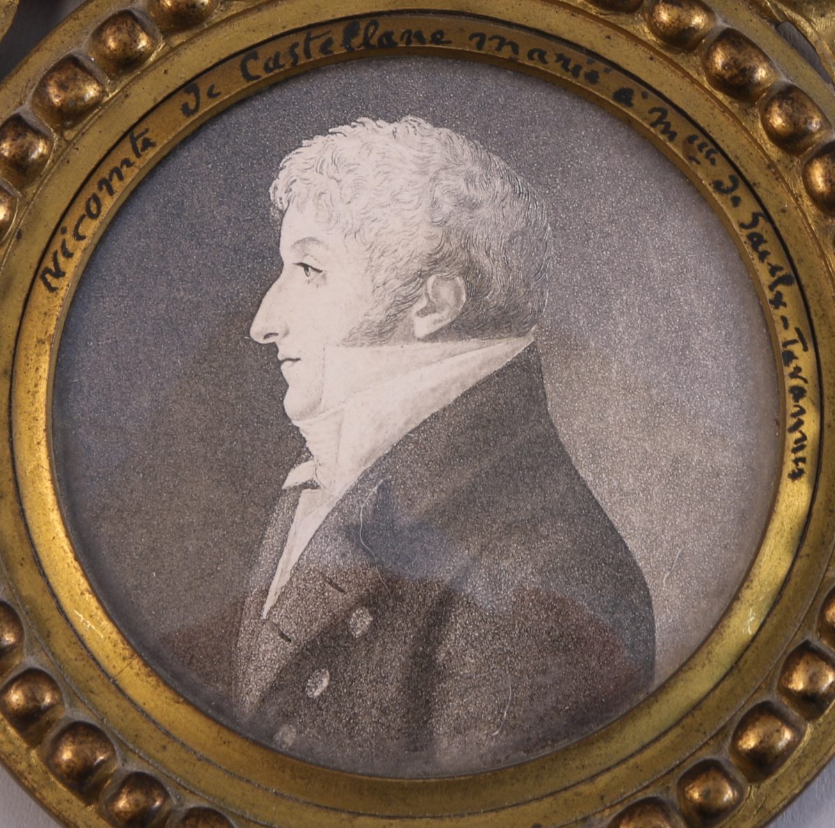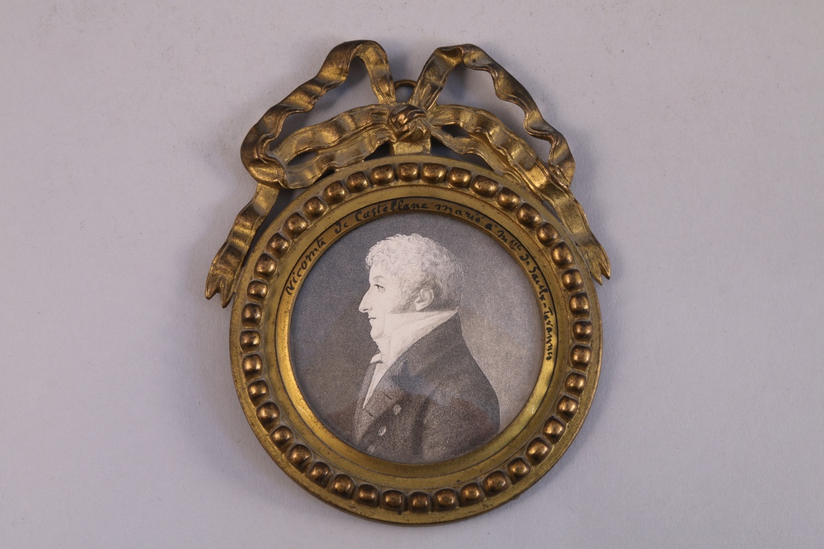 PORTRAIT du VICOMTE de CASTELLANE au physionotrace. Dans un cadre circulaire en bronze doré, orné d'un ruban noué et portant la mention " Vicomte de Castellane marié à Mlle de Saulx-Tavannes".