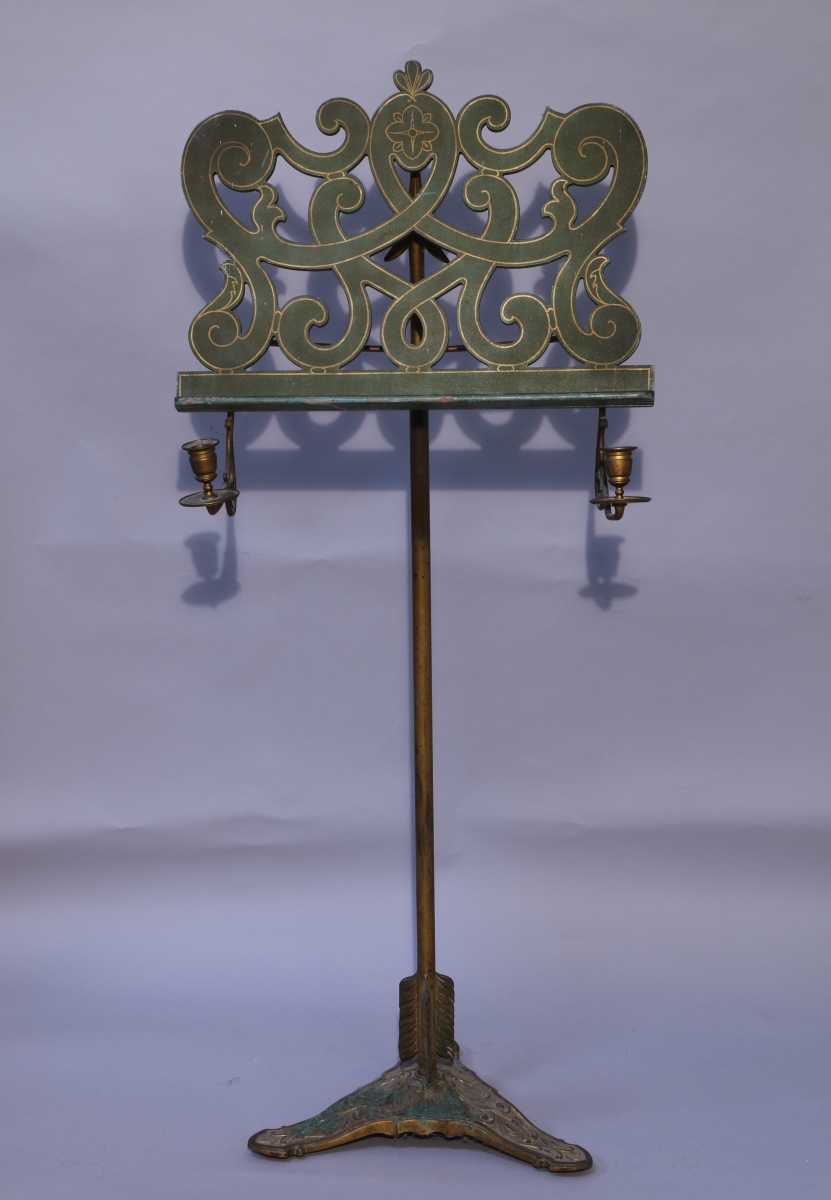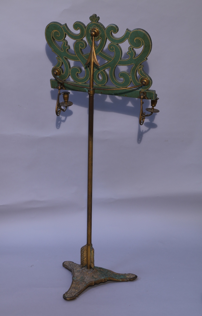 LUTRIN en bronze ciselé, doré et bois rechampis vert et or. Le pupitre ajouré, soutenant deux bougeoirs, le fût en forme de flêche repose sur un trépied orné de rinceaux stylisés.