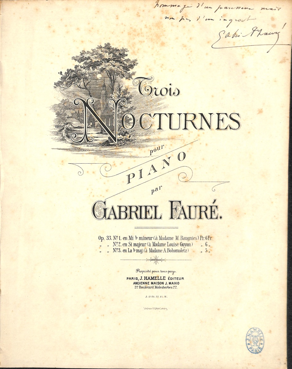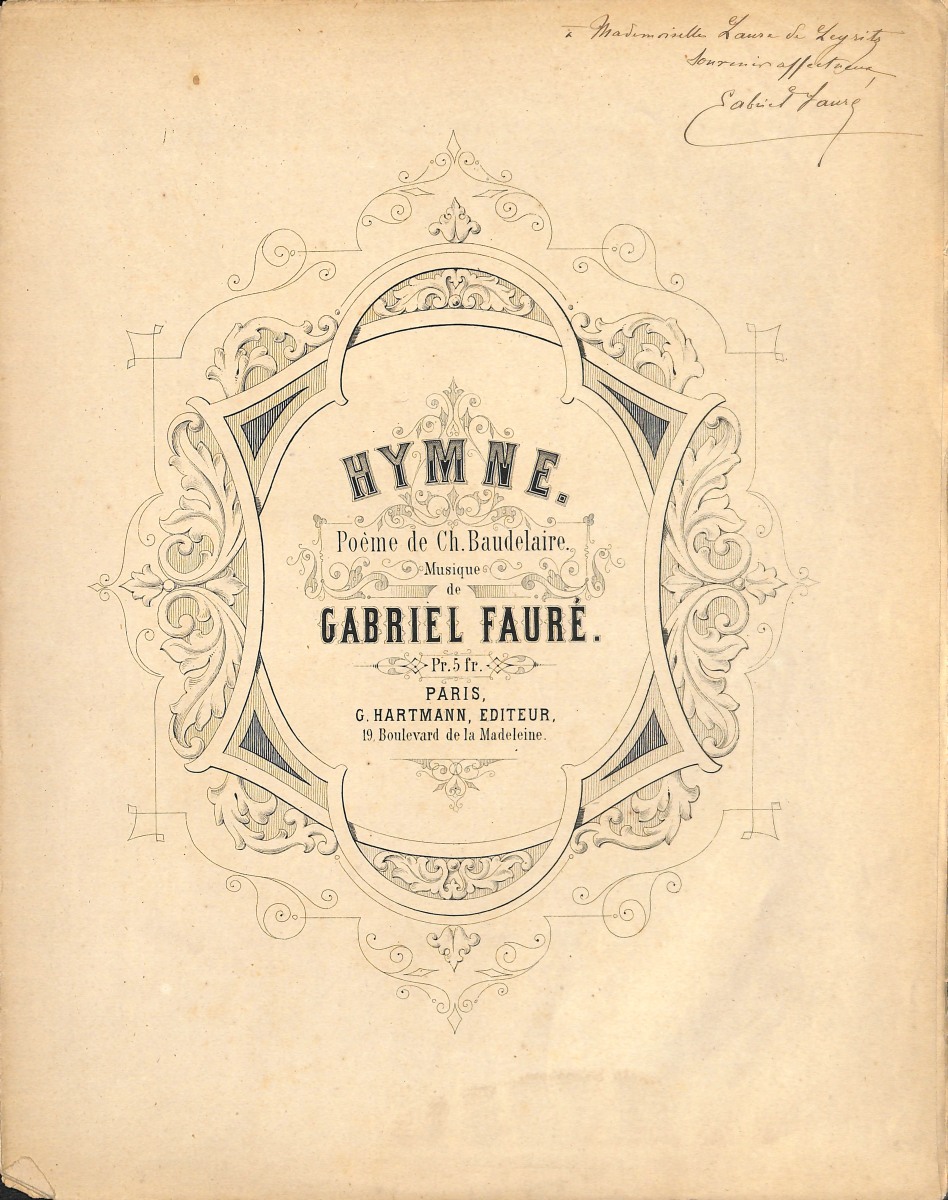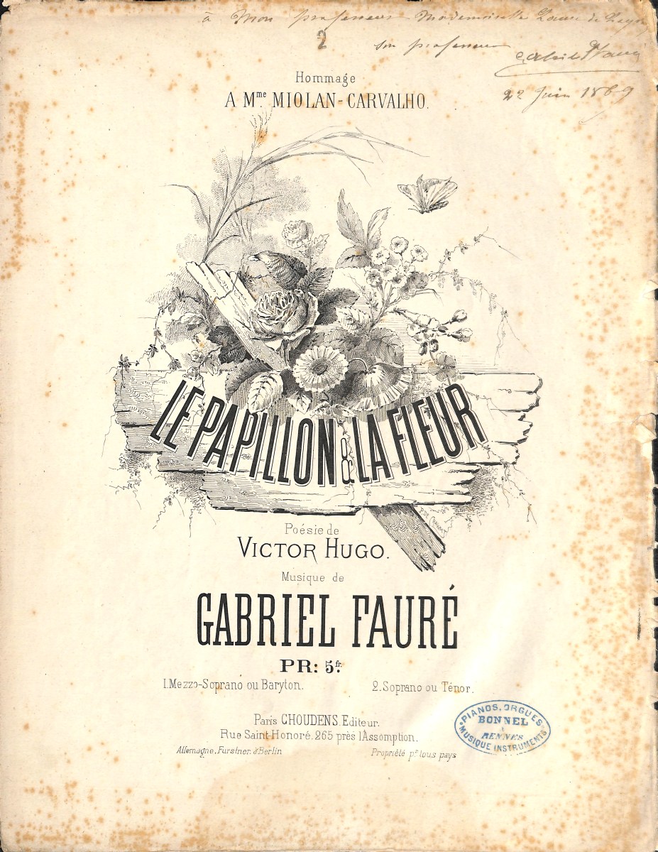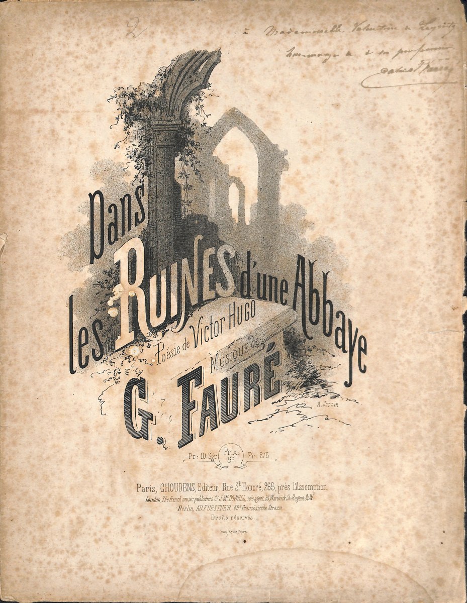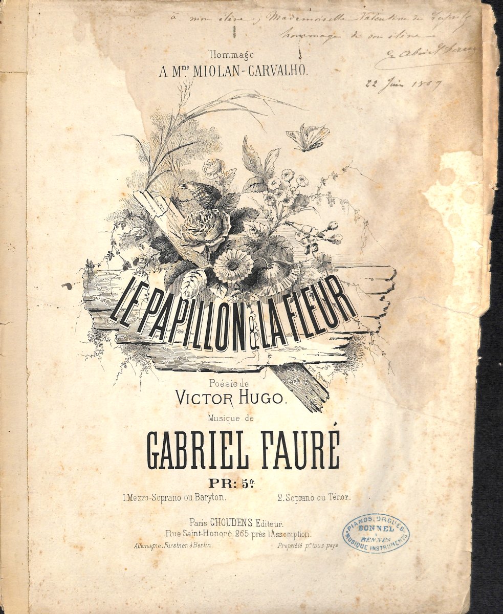 Réunion de 5 partitions musicales imprimées avec envois dédicacés, in-fol. En l'état (tâches, déchirures): " Dans les ruines d'une abbaye, poésie de Victor Hugo ", Choudens édit. avec envoi manuscrit signé " à Mademoiselle Valentine de Leyritz, hommage de son professeur ", [1] + 5 pp. - 2 exemplaires " Le papillon et la fleur, poésie de Victor Hugo ", Choudens édit., tampon bleu " Pianos, orgues Bonnel à Rennes ", [1] + 5 pp., l'un avec envoi manuscrit signé et daté: " à mon professeur mademoiselle Laure de Leyritz, son professeur, 22 juin 1869 ", et l'autre avec envoi manuscrit signé et daté: " à mon élève mademoiselle Valentine de Leyritz, hommage à son élève, 22 juin 1869 " - " Hymne, poème de Ch. Baudelaire ", Hartmann édit., avec envoi manuscrit signé: " à Mademoiselle Laure de Leyritz, souvenir affectueux ", [1] + 7 pp. - " Trois nocturnes pour piano ", Hamelle édit., avec envoi manuscrit signé: " Hommage d'un paresseux mais non pas d'un ingrat ", tampon bleu " J. Hamelle Paris ", [1] + 9 pp. + [1] + 9 pp. + [1] + 6 pp.