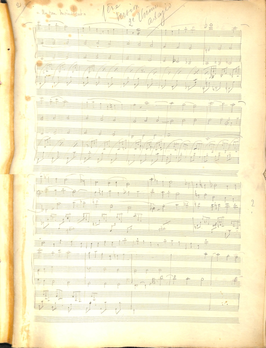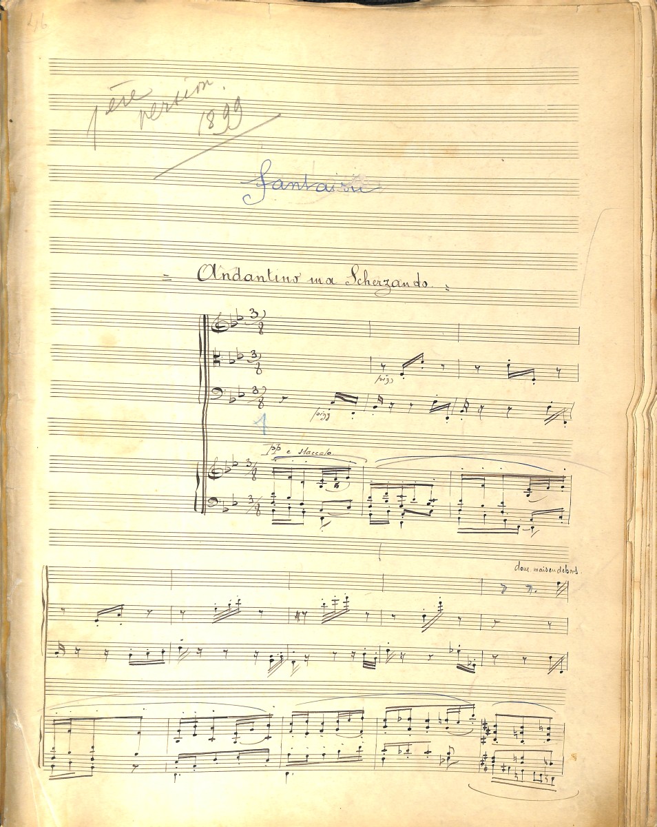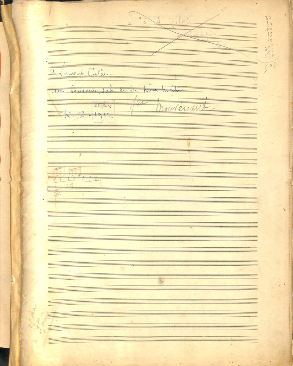 Manuscrit musical autographe (dossier génétique) intitulé " Quatuor en sol (m) pour piano et cordes ", 1899-1912, sur papier Lard-Esnault/Bellamy à 26 lignes, écrits au crayon, à l'encre, avec corrections aux crayons rouge et bleu, et commentaires pour la composition (esquisses, plan, retours, cycliques, thèmes, modulations, etc), 102 pages in-fol. montées sur charnière. Titre sur la couverture cartonnée. Envoi signé " à Laurent Cellier en souvenir sale de son vieux maître/ R.D. 1912 ".