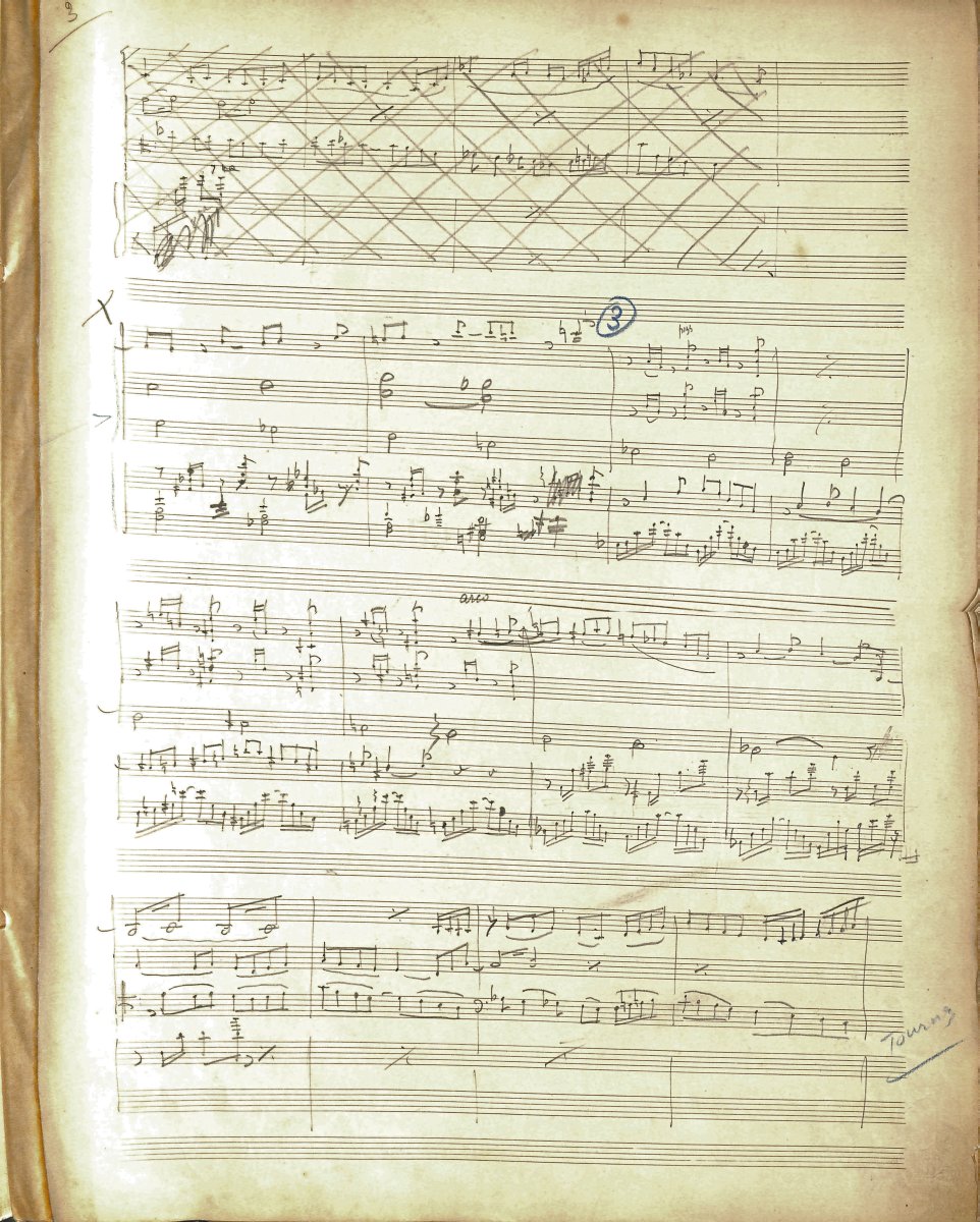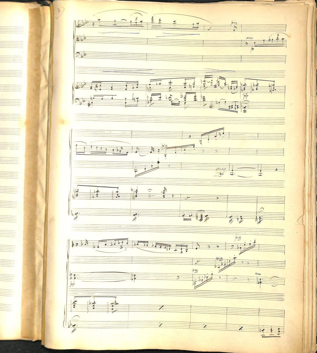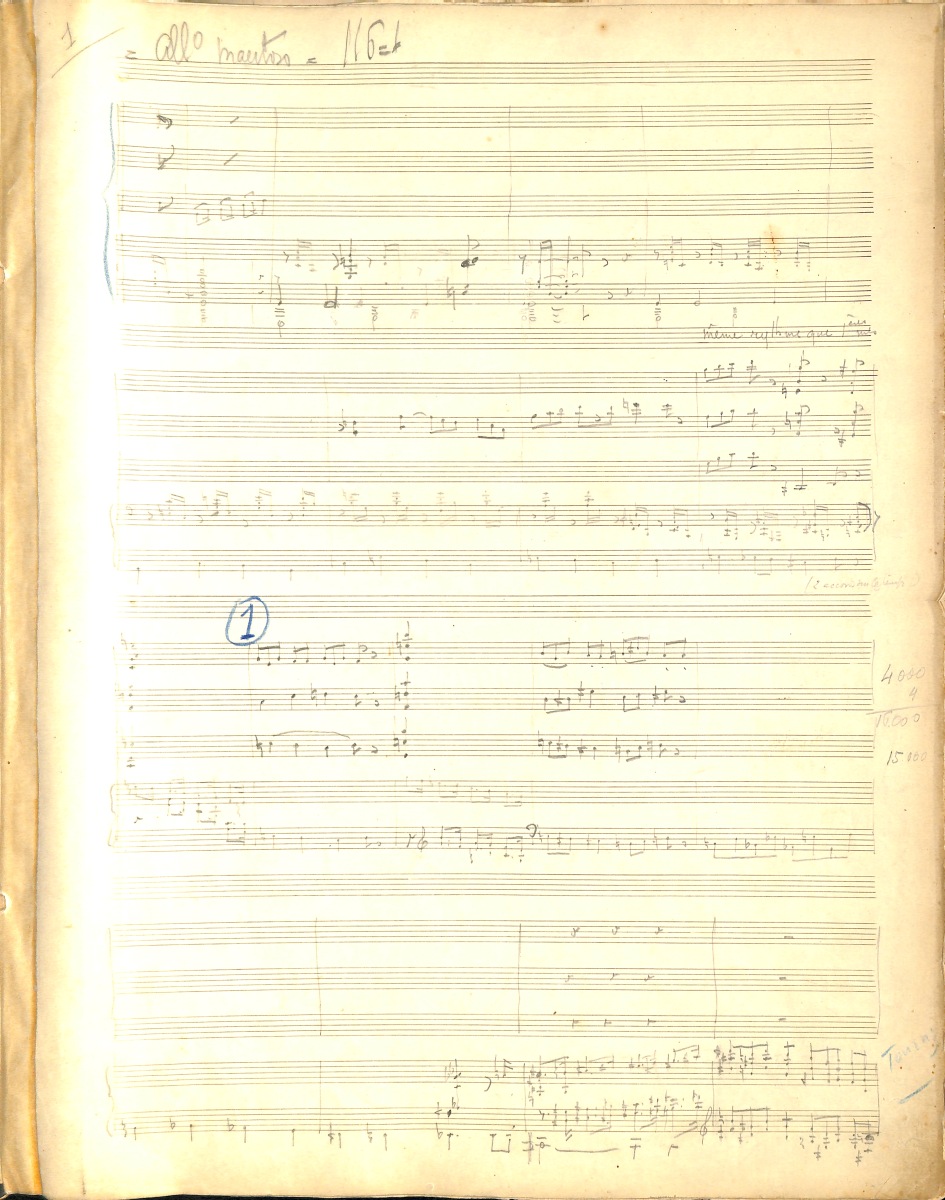 Manuscrit musical autographe (dossier génétique) intitulé " Quatuor en sol (m) pour piano et cordes ", 1899-1912, sur papier Lard-Esnault/Bellamy à 26 lignes, écrits au crayon, à l'encre, avec corrections aux crayons rouge et bleu, et commentaires pour la composition (esquisses, plan, retours, cycliques, thèmes, modulations, etc), 102 pages in-fol. montées sur charnière. Titre sur la couverture cartonnée. Envoi signé " à Laurent Cellier en souvenir sale de son vieux maître/ R.D. 1912 ".