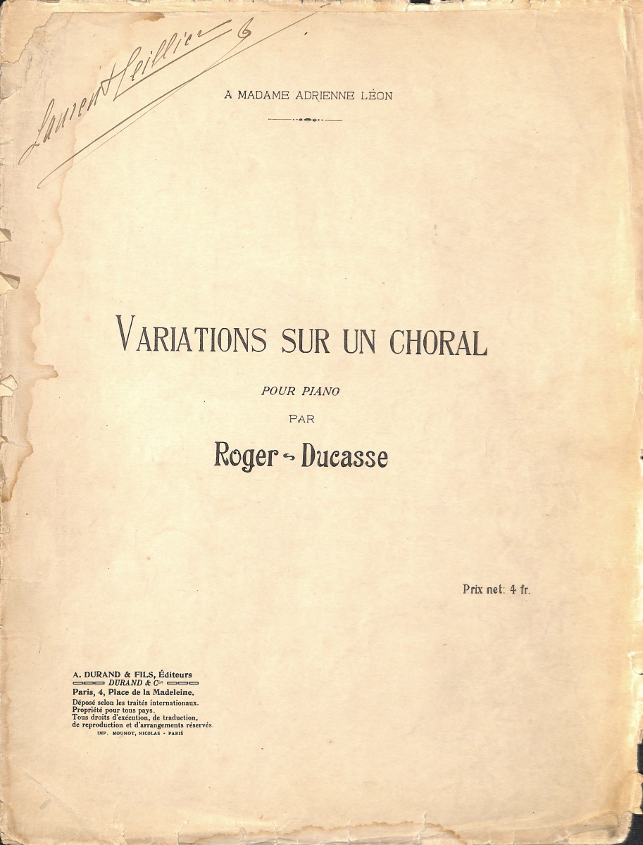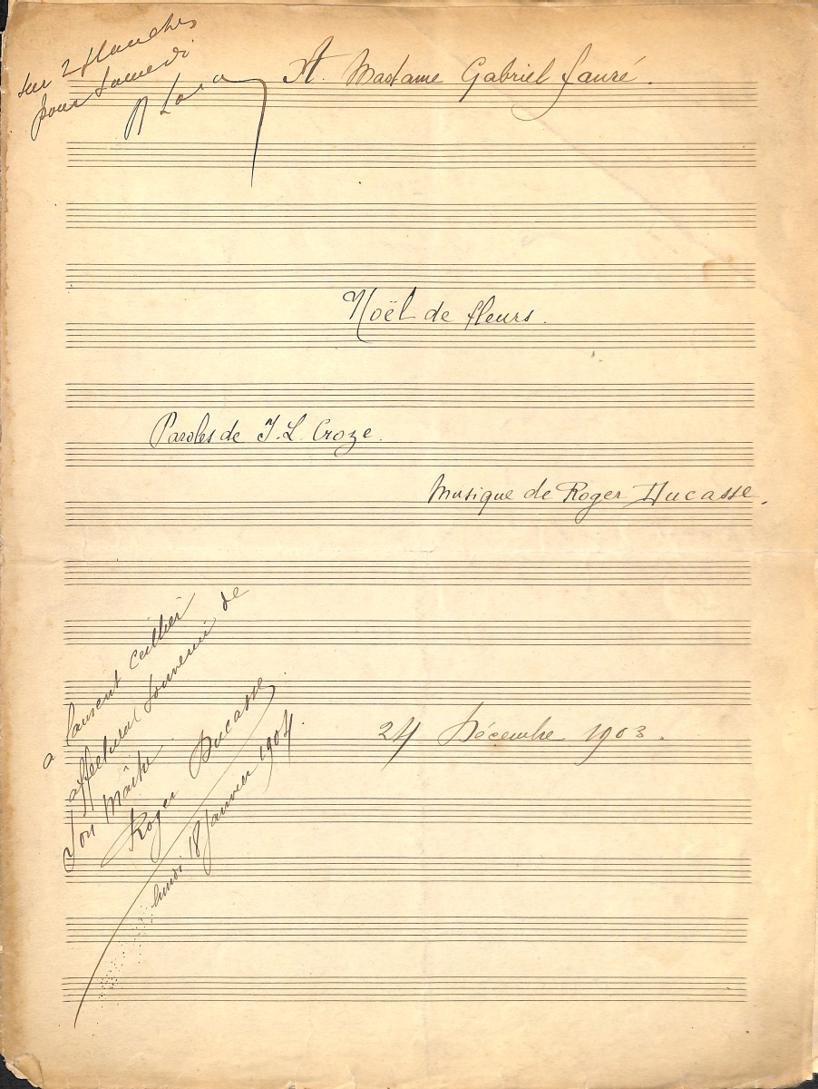 Manuscrit musical autographe intitulé " Noël de fleurs ", 1903, à l'encre, avec notes de graveur et corrections au crayon, [1] + 2 pp. in-fol., dédié à madame Gabriel Fauré, avec envoi signé par le compositeur: " à Laurent Ceillier, affectueux souvenir de son maître/ lundi 18 janvier 1904 " - Manuscrit musical autographe " [Pastorale pour orgue] ", au crayon, 1 page in-fol., incomplet ; édité en 1909 par Durand - Partition imprimée " Variations sur un choral pour piano ", Durand édit., avec doigtés au crayon , [1] + 17 pp. in-fol.
