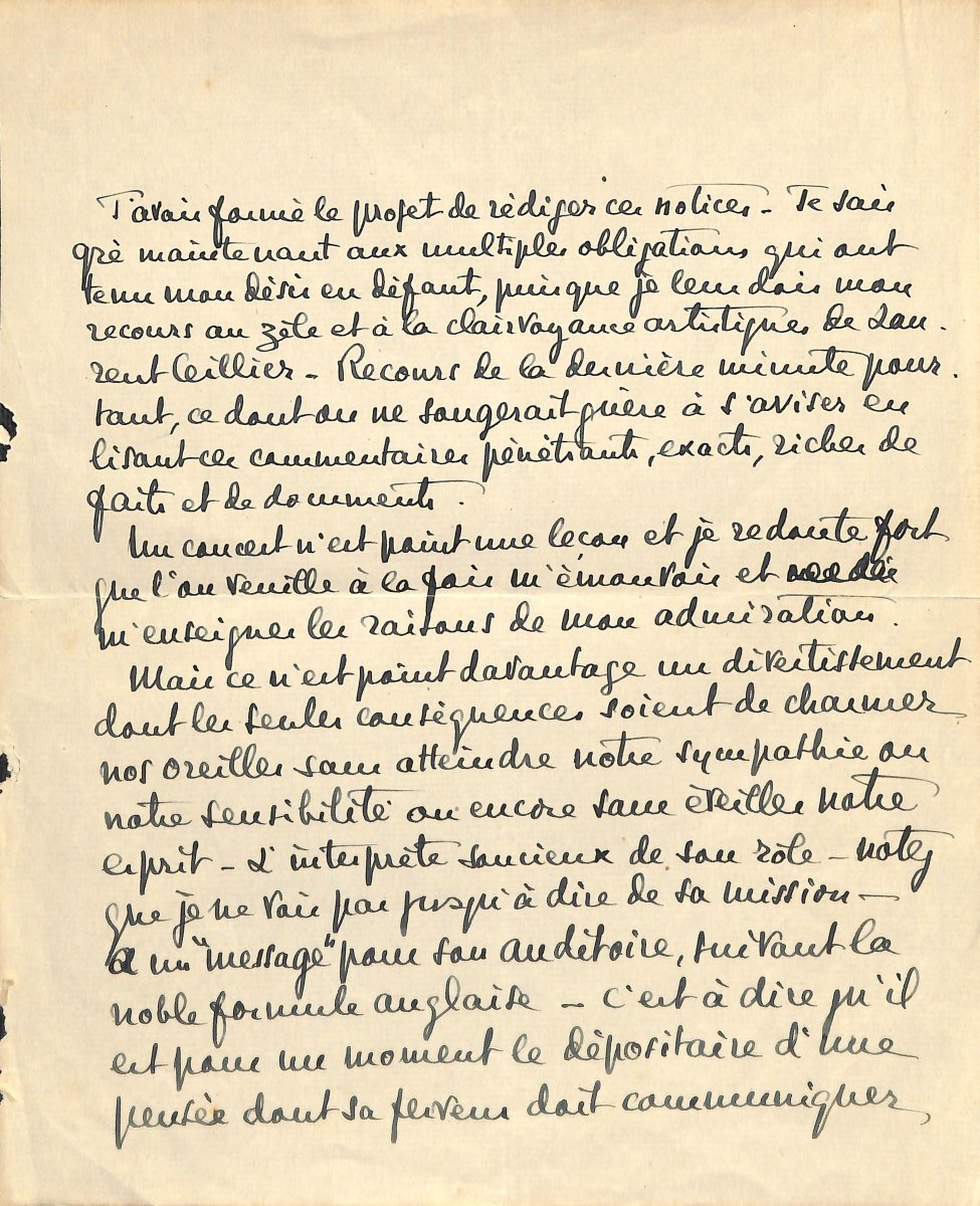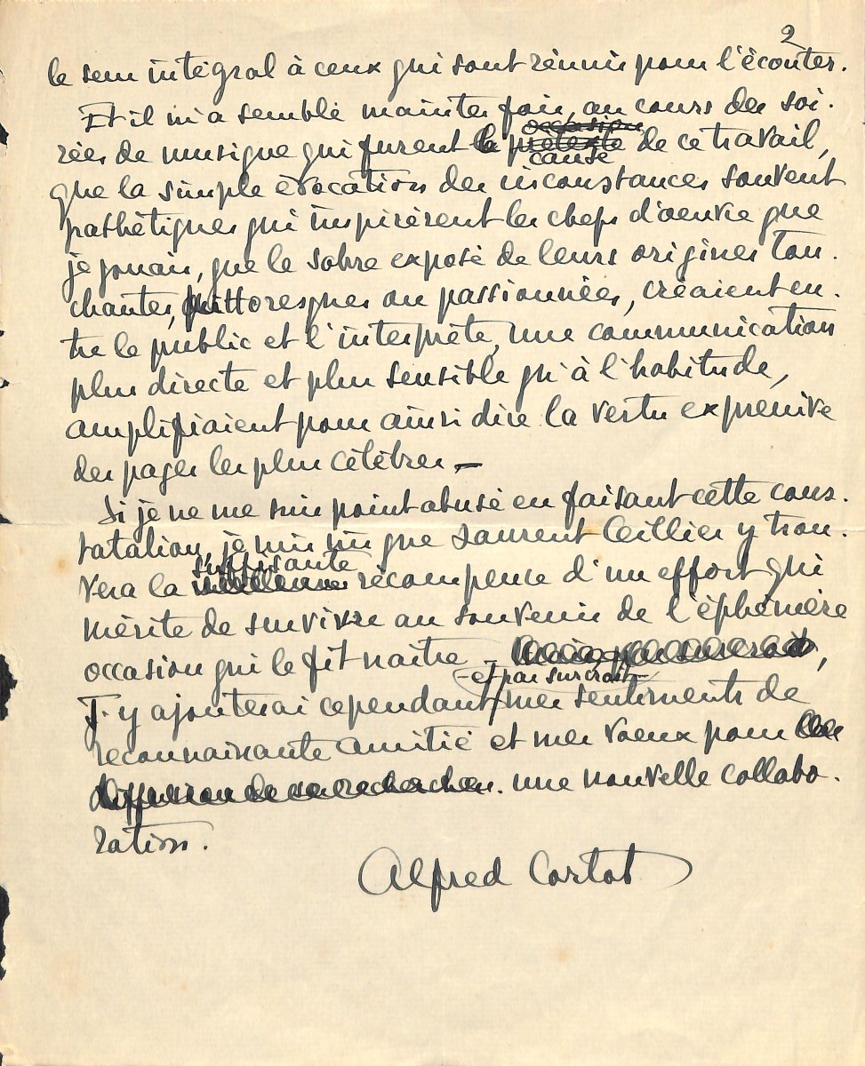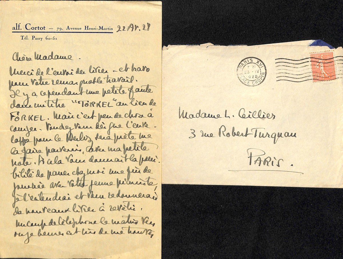 Longue L.A.S., 2 pages in-4, s.d., Cortot remercie chaleureusement Laurent Ceillier pour son travail et sa collaboration à l'édition de l'ouvrage " Les chefs-d'uvre du piano au 19e siècle: 10 concerts par A. Cortot ", paru en mai 1924 ; les notices documentaires, initialement projetées par Cortot, furent rédigées par Laurent Ceillier: " J'avais formé le projet de rédiger ces notices. Je sais gré maintenant aux multiples obligations qui ont tenu mon désir en défaut, puisque je leur dois mon recours et à la clairvoyance artistique de Laurent Ceillier. Recours de la dernière minute pourtant, ce dont on ne songerait guère à s'aviser en lisant ces commentaires pénétrants, exacts, riches de faits et de documents. Un concert n'est point une leçon et je redoute fort que l'on veuille à la fois m'émouvoir et m'enseigner les raisons de mon admiration (