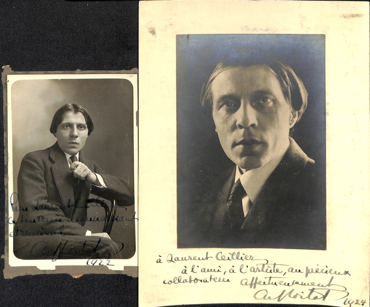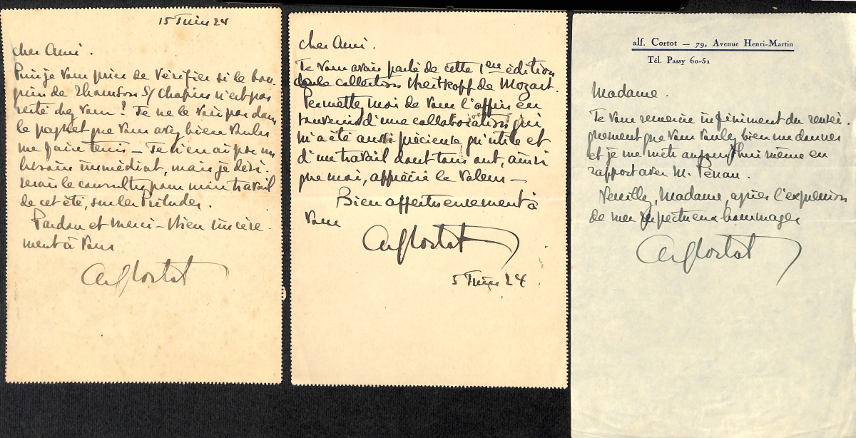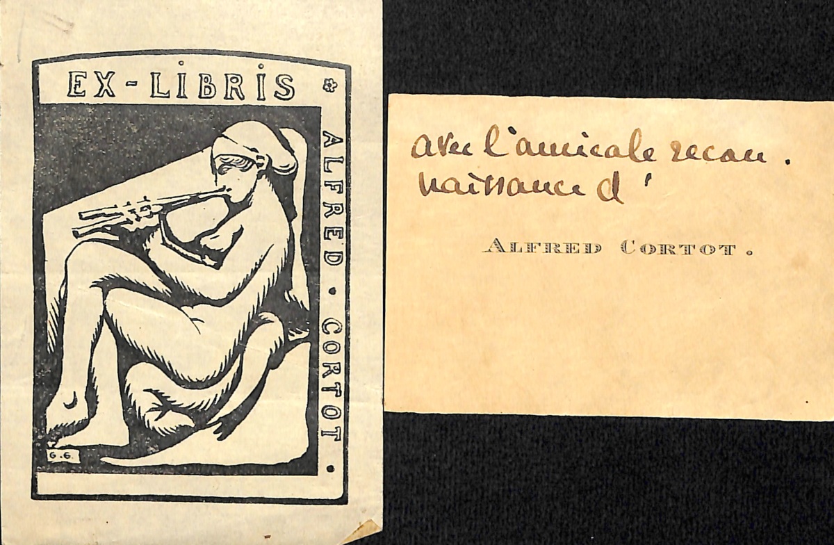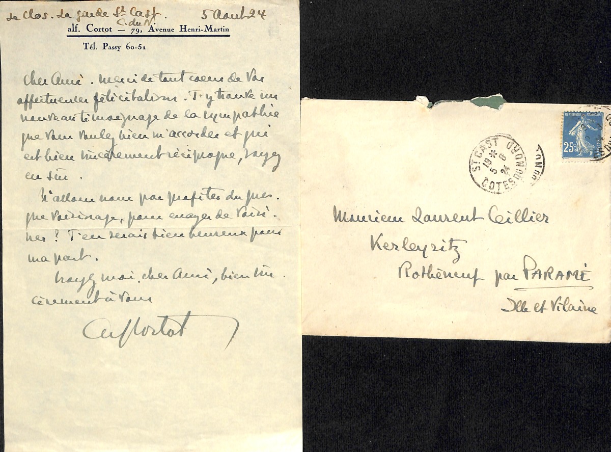 " - L.A.S. et 2 P.A.S. (cartes pneumatiques), à Laurent Ceillier, 1924 - 2 L.A.S. dont une avec enveloppe à la veuve Ceillier - Carte de visite avec mention manuscrite - Ex-libris de Cortot - Portrait photographique, 14,5 x 9,5 cm, avec envoi manuscrit dédicacé et daté 1922: " Pour Laurent Ceillier, ce souvenir reconnaissant et amical " - Portrait photographique, 22,5 x 17 cm, avec envoi manuscrit dédicacé et daté 1924: " A Laurent Ceillier, à l'ami, à l'artiste, au précieux collaborateur ".