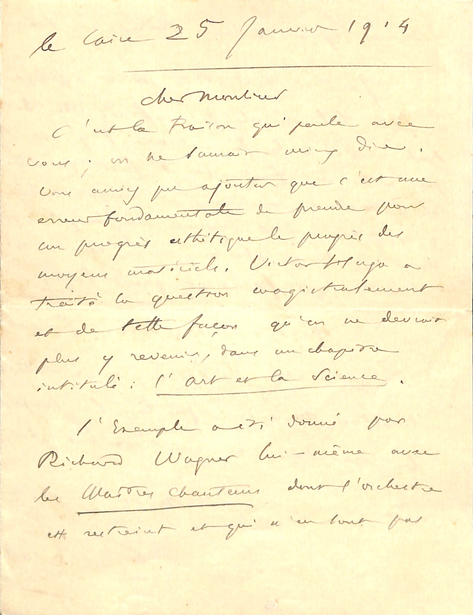 L.A.S., du Caire du 25 janvier 1914, 3 pages in-8 sur un double feuillet, adressée à Laurent Ceillier ; Saint-Saëns, symbole du classicisme musical, en pleine critique de la nouveauté et du progrès: " Cher monsieur c'est la raison qui parle avec vous ; on ne saurait mieux dire. Vous auriez pu ajouter que c'est une erreur fondamentale de prendre pour un progrès esthétique le progrès des moyens matériels. (