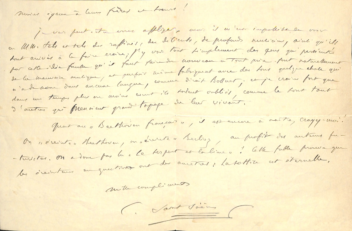 ) Je vais peut-être vous affliger, mais il m'est impossible de voir en MM. Tels et Tels des raffinés, des délicats, de profonds musiciens, ainsi qu'ils sont arrivés à le faire croire ; j'y vois tout simplement des gens qui persécutés par cette idée fausse qu'il faut faire du nouveau à tout prix, font naturellement de la mauvaise musique, et parfois même fabriquent avec des sons quelque chose qui n'a de nom dans aucune langue, comme disait Bossuet ; et je crois fort que dans un temps plus ou moins court ils soient oubliés, comme le sont tant d'autres qui prenaient grand tapage de leur vivant. Quant au " Beethoven français ", il est encore à naître croyez-moi! On " éreinte " Beethoven on " éreinte " Berlioz, au profit des auteurs futuristes. On a donc pas lu " Le Serpent et la lime "! Cette fable prouve que les éreinteurs en question ont des ancêtres: la sottise est éternelle