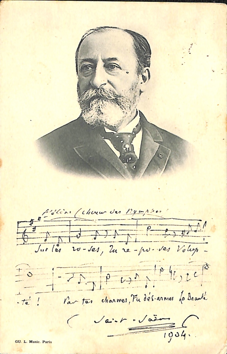 " - Carte de visite avec mention manuscrite: " Je l'ai lue en entier et elle m'a fait grand plaisir " - Carte postale à l'effigie de Saint-Saëns au recto et bref texte manuscrit et signature du compositeur à l'adresse de Roger-Ducasse: " La répétition a lieu seulement à 3h ½ ".