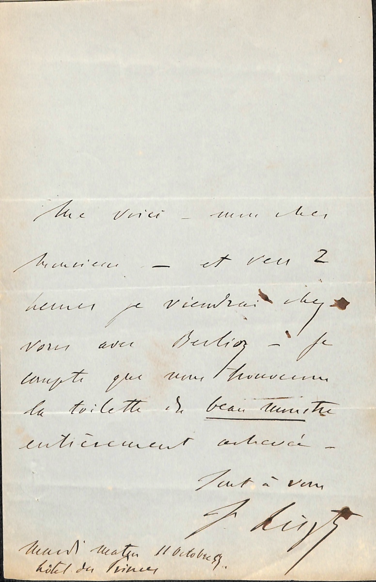 L.A.S., " Hôtel des Princes " [Paris], 11 octobre 1853, ¾ de page in-8, adressé à Richard Wagner?: " Me voici, mon cher monsieur, et vers 2 heures je viendrai chez vous avec Berlioz. Je compte que nous trouverons la toilette du beau monstre entièrement achevée. Tout à vous
