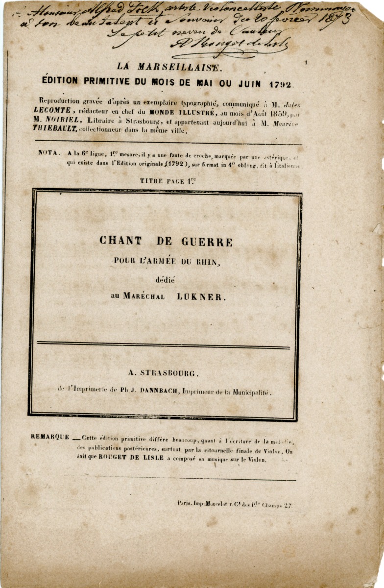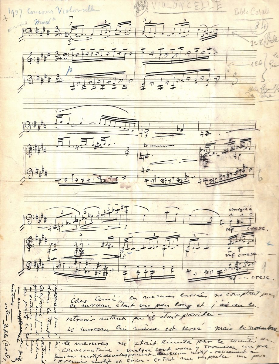 Pablo CASALS (1876-1973), manuscrit musical autographe " Violoncelle ", 1907, à l'encre noire et crayon, avec mention en haut de page au crayon bleu " 1907 concours violoncelle ", 4 pages in-fol., et en fin de page " Villa Molitor, Paris, 16e ", texte manuscrit et signé du compositeur: " Cher ami, les mesures barrées ne comptent pas, le morceau était un peu long et j'ai dû le rétrécir autant qu'il était possible. Le morceau lui même est serré - mais le nombre de mesures m'était limité par le comité du conservatoire - malgré tout vous y trouverez un premier motif, développement, deuxième motif, ralliement au premier motif et coda. Le tout me rappelle un parc japonais que j'ai vu dans le temps en Californie qui contenait grand nombre d'arbres, de sentiers, des lacs, des ponts le tout en un emplacement de quelques mètres. Vôtre Pablo Casals " - Max d'OLLONE (1875-1959), morceau de manuscrit musical autographe, sur papier oblong, à l'encre, fragment de mélodie en sol b M " O nuit, ô douce nuit d'été ", avec mention " Nuit d'été, 1899 ", signature du compositeur et daté août 1909. - Emile DESPORTES (1878-1944), manuscrit musical autographe " Suite de danses anciennes " pour orchestre, 7 morceaux, à l'encre, 26 pages in-fol. dans une chemise verte cartonnée sur laquelle est inscrite un envoi signé: " Aux bons soins de mon ami Rémi Ceillier auquel je la recommande et la dédie/ mai 1909 ". - Reproduction gravée de l'édition primitive de La Marseillaise, vers 1865-1870, avec envoi signé du petit neveu de Rouget de l'Isle, 4 pages in-4.