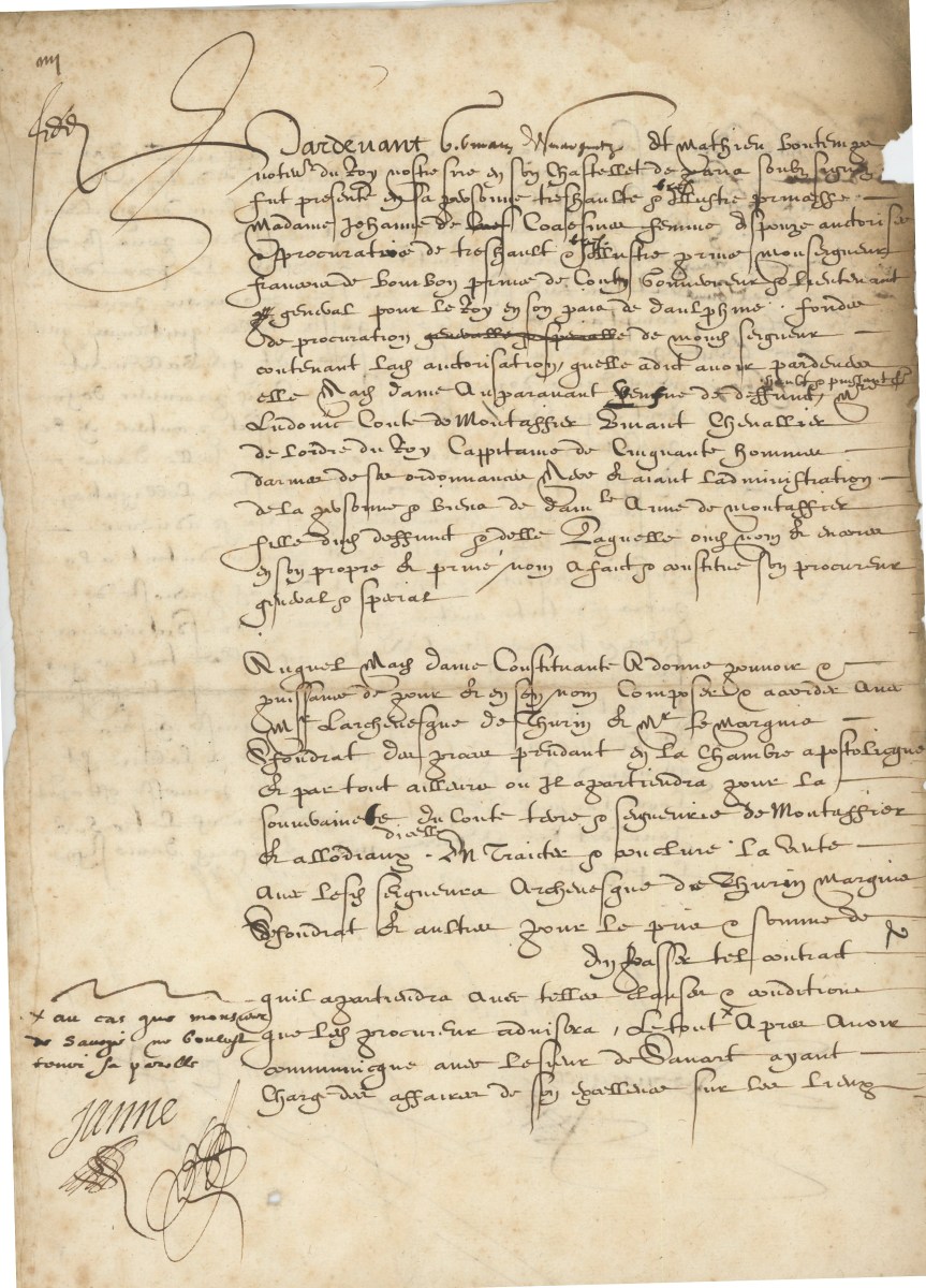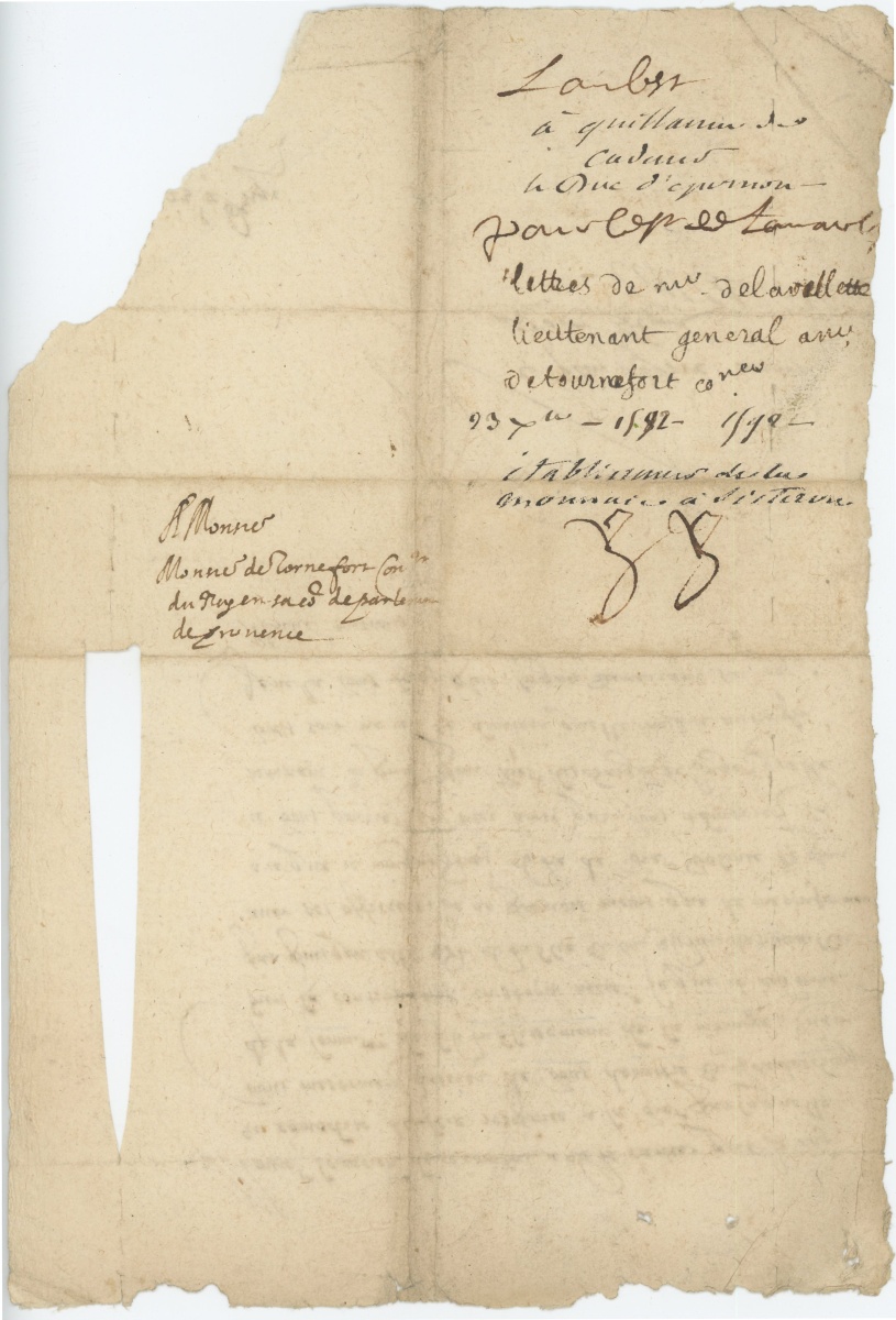 L.S. avec compliment par Jean-Louis NOGARET de La VALETTE (1554-1642), duc d'Epernon, bras droit et l'un des mignons du roi Henri III, 23 décembre 1592, adresse " Mons. de Tournefort conseiller du roy en parlement de Provence ", 1 page in-4 (manques) ; le duc d'Epernon, gouverneur de Provence, écrit à Guillaume Cadenet de Tournefort, conseiller au parlement de Provence, au sujet de sa charge en la commission de l'établissement de la monnaie à Sisteron. - P.S. par Jeanne de COESME (1560-1601), princesse de Conti, épouse de François de BOURBON, Paris, 3 octobre 1599, 2 pages in-fol. ; Procuration enregistrée devant les notaires au Châtelet de Paris et accordée à l'archevêque de Turin.